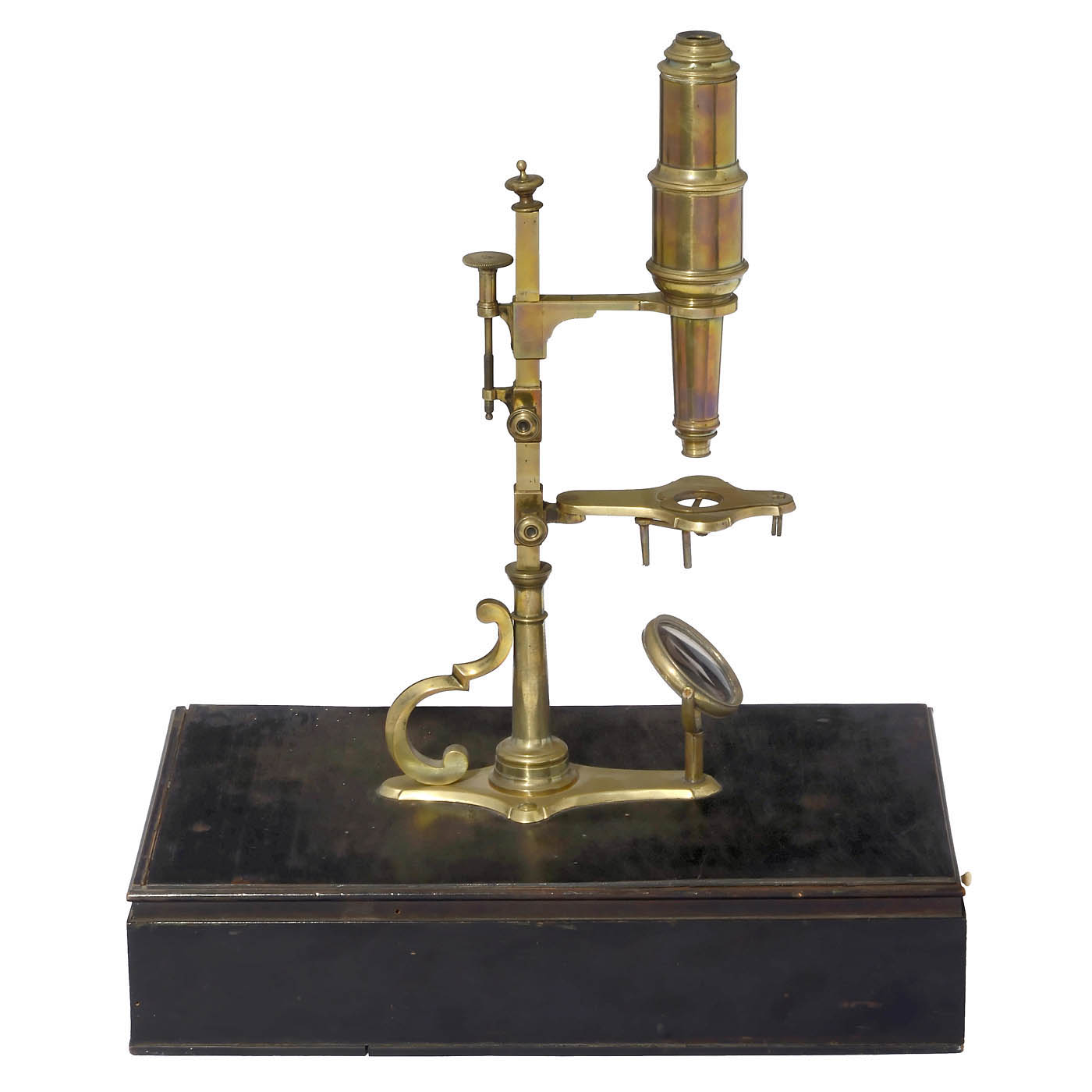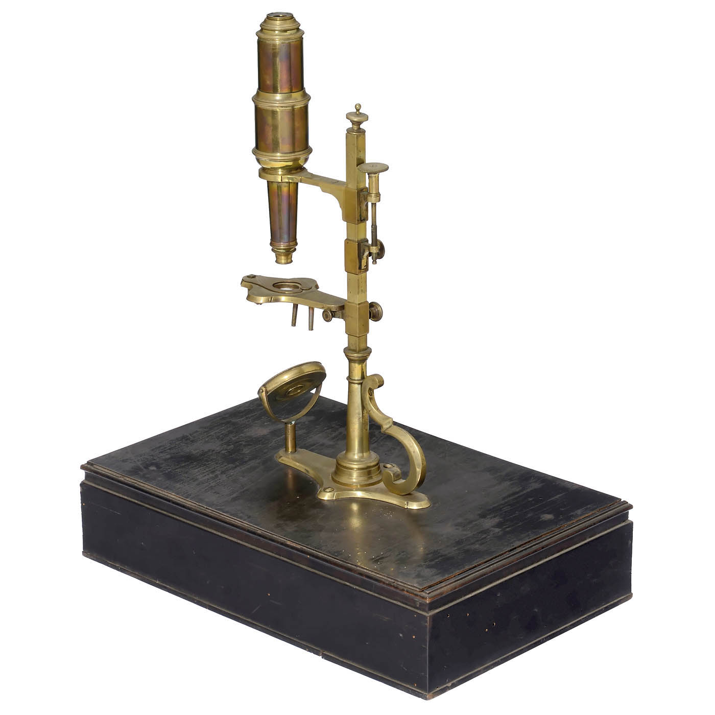 Cuff-type brass microscope with gimbaled 1 1/2 in. single mirror, three-arm stage on sliding block for coarse focusing, milled-head screw fine adjustment to the tube, with threaded mount to rectangular ebonized wood box base with drawer (12 ½ x 7 4/5 in.), height without box base 11 3/4 in., with 1 ocular and 5 objective lenses, 6 boxwood specimen slides and forceps.