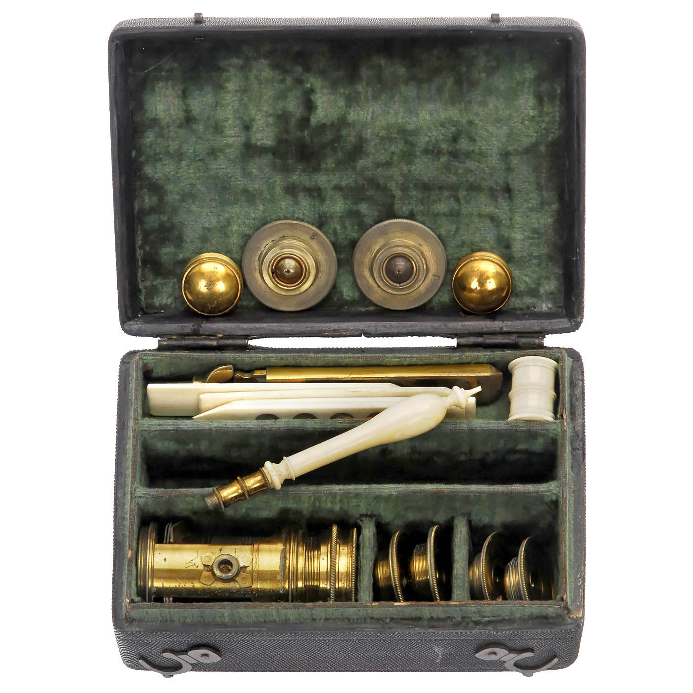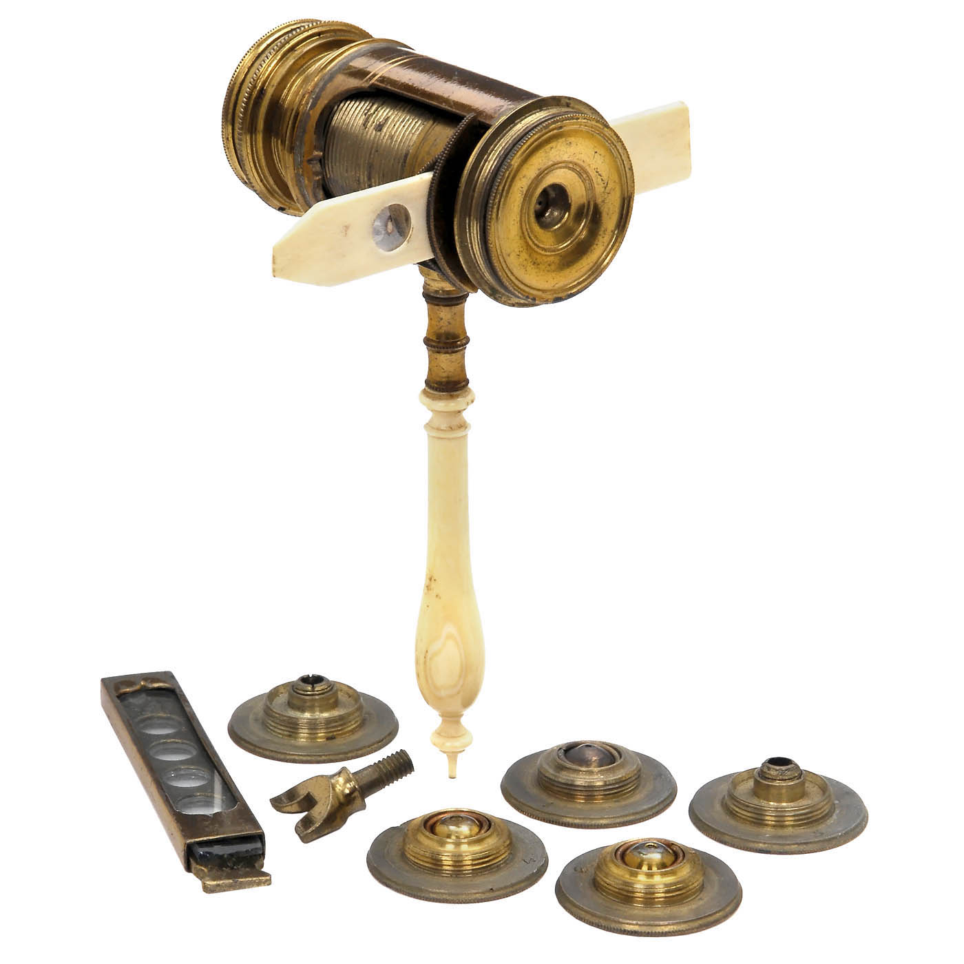 Simple microscope based on design by Hartsoeker, lacquered brass, detachable turned bone handle, 1½-inch inner-tube, 1 5/8-inch outer tube with steel spiral spring, threaded focusing, brass spring clamp slide-holder and lens. With 6 numbered lenses (1 to 6), 4 bone specimen sliders and 1 brass slider in fitted black sharkskin-covered wood case with green velvet lining.