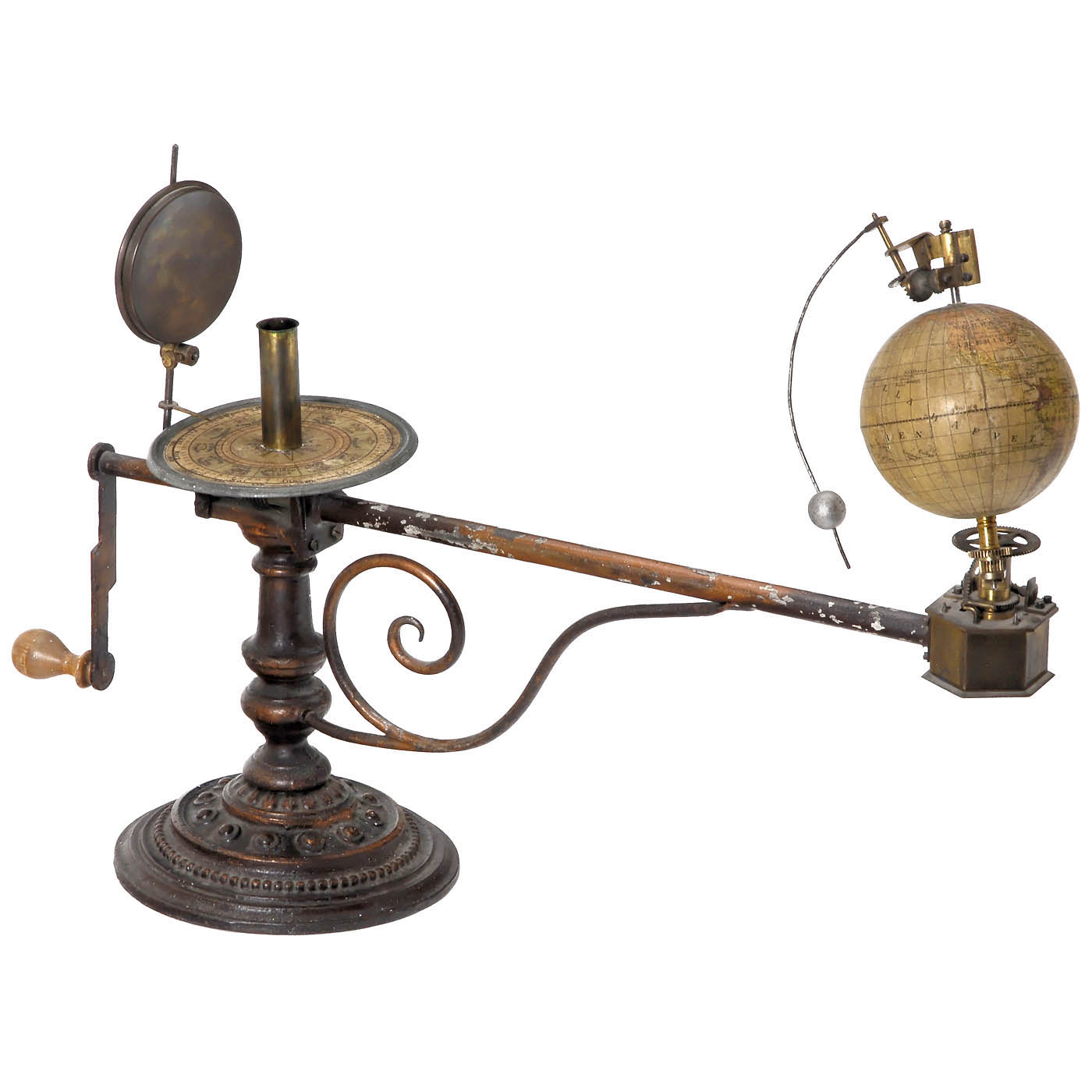 Hand-turned physical demonstration model depicting the sun as a candle with brass reflector, 4-inch papier-mâché earth globe made up of 12 lithographed gores with cartouche: "Jorden AK", bronzed cast metal and lacquered brass stand, with compass showing the houses of the zodiac and inscription in German, overall length 22 4/5 in., moon mechanism incomplete, otherwise working.