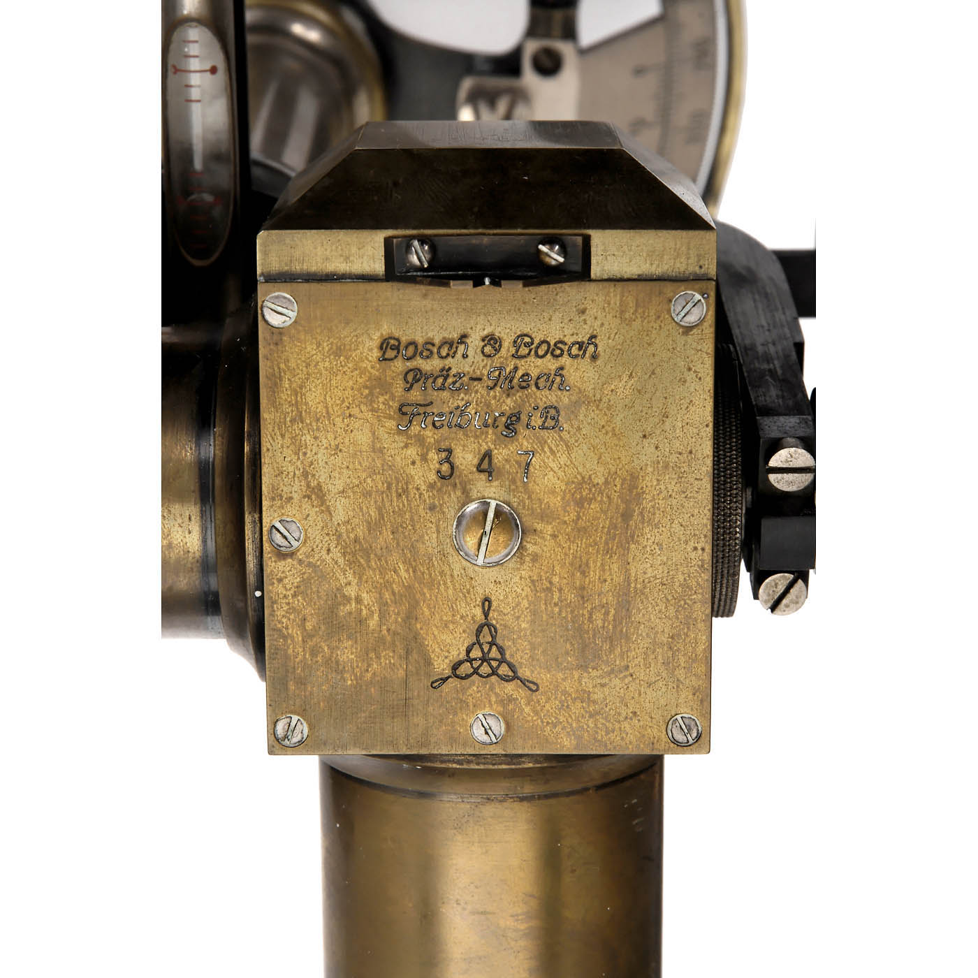 1) Balloon theodolite, no. 347, marked: "Bosch & Bosch, Freiburg i.B.", brass, nickel-plated screws and scales, telescope length 10 ½ in., horizontal circle 6 ¾ in., vertical circle 4 ½ in., simple sighting device and bubble level. - And: 2) Plane table alidade with telescopic sight, unsigned, partly nickel-plated brass, telescope with rack-and-pinion focusing, length 14 1/5 in.