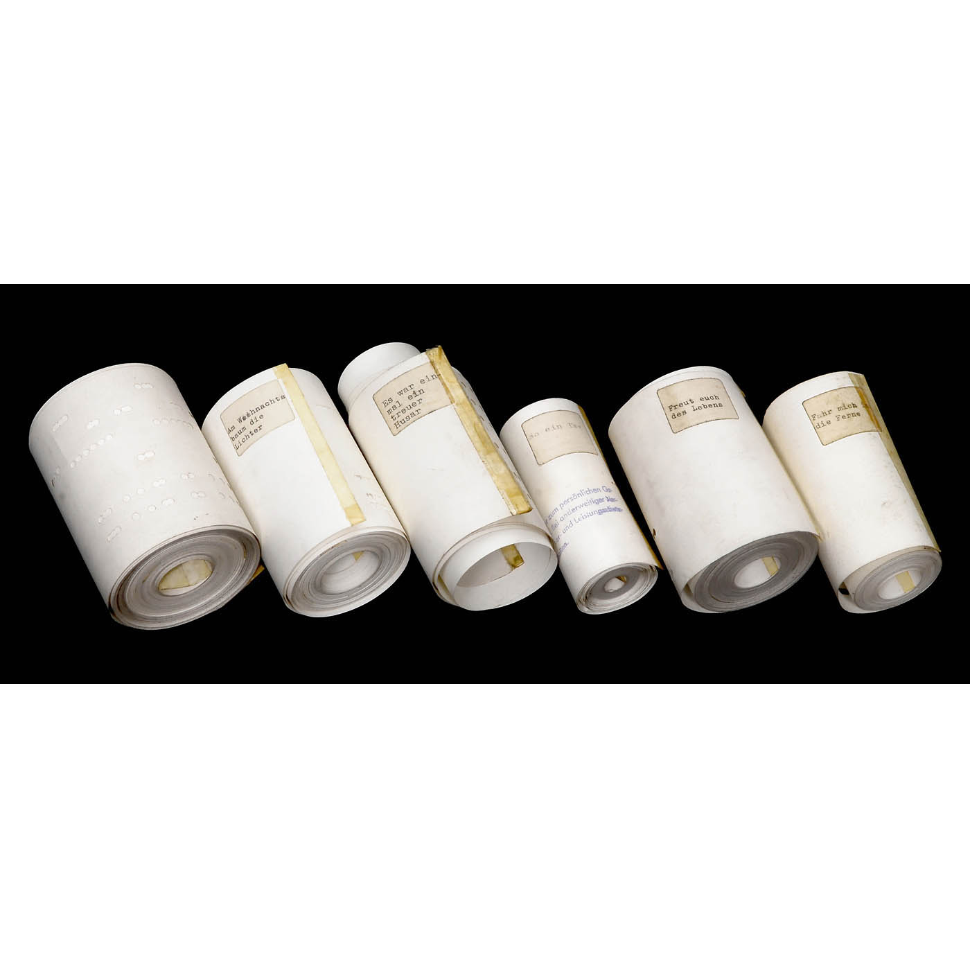 Paper roll organ, unmarked, 16 notes, hand-cranked, painted wood case, size 25 ½ x 13 1/3 x 28 1/3 in, height with cart 51 in., with 6 paper rolls, working.