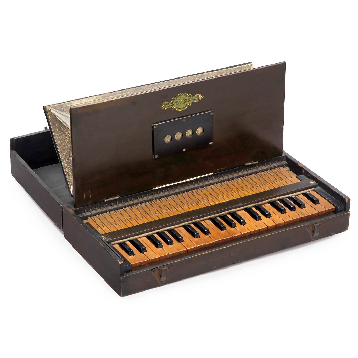 1) Ariston table organette by Paul Ehrlich, Leipzig. 24 reeds, for Ø 13 in. card discs, wood case, crank-operated, unrestored. - 2) English Automatic Seraphone, by Maxfield & Sons, London, for perforated paper rolls, 20 reeds, crank-operated, small rewind crank, without rolls, untested. - And: 3) Maharaja Flute, Ramsingh and Brothers, Bombay (Mumbai), 39 notes, hand-operated bellows, in wood case, good playing condition.