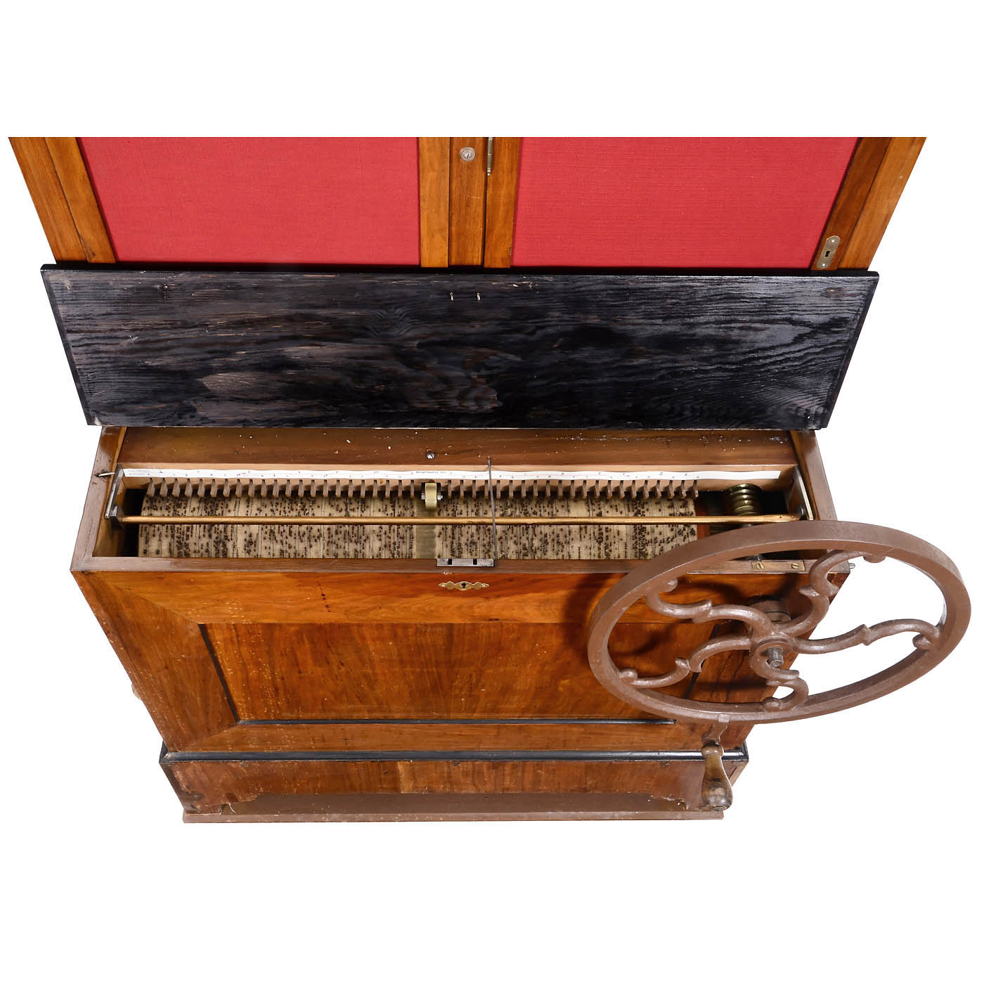 Barrel organ by Gebrüder Riemer, Kratzau, Bohemian. 43 clavis, 6 optional registers: Bombardon, Baritone, Cornets, Quinta, Suboctave and Trumpet, 9 tunes, hand-turned, dimensions 42 x 25 ½ x 65 in., weight approx. 200 kg. Good restored playing condition, pipes partly in need of tuning.