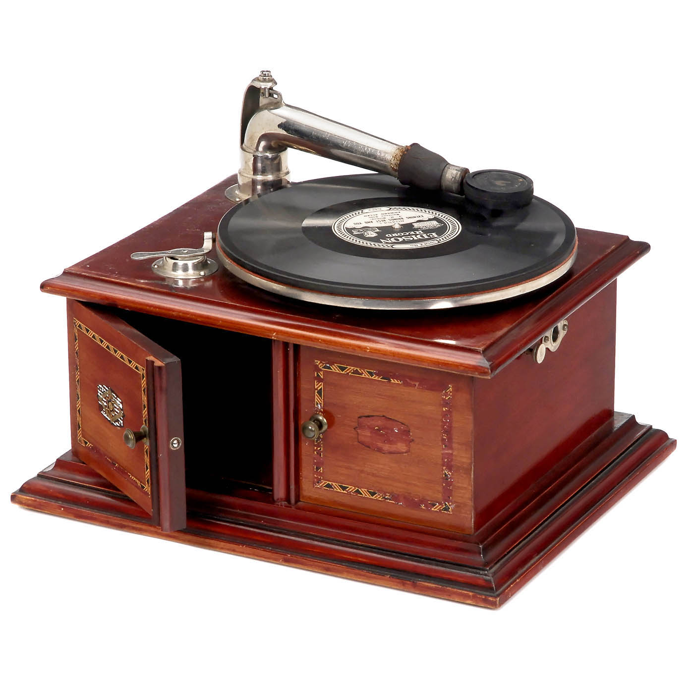 1) Unmarked, mahogany-stained case, tone arm with Pathé reproducer (without sapphire), with one Edison record, without crank, untested. - And: 2) Marked on plaque "Johann Arlett, Wien", red-brown-stained case, "Veni Vidi Vici" reproducer, with crank, working.