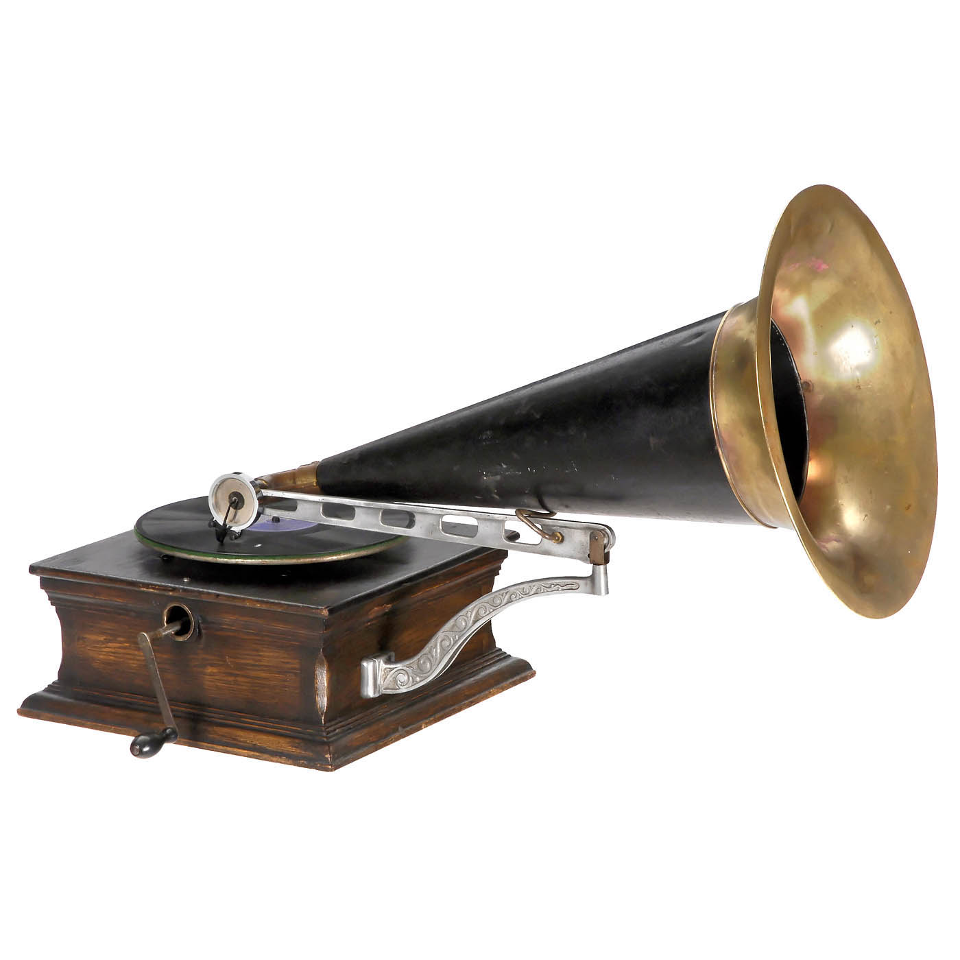 Marked "Isidro Aller-Leon", oak cabinet with brass maker's plaque, single-spring motor, 10-in. turntable, traveling arm, mica soundbox, brass horn, Ø 11 3/4 in., good playing condition.