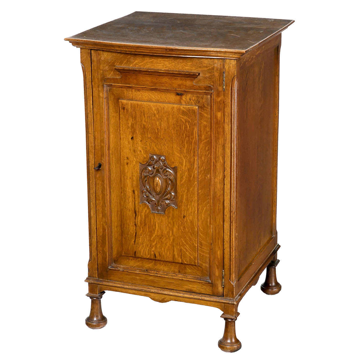 Oak, with eight drawers, with lock and key, dimensions 20 x 21 x 34 in. Also suitable as horn gramophone base cabinet.