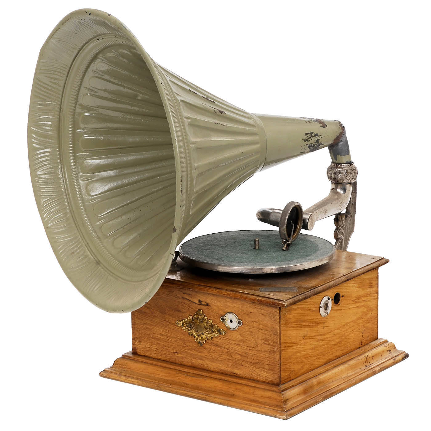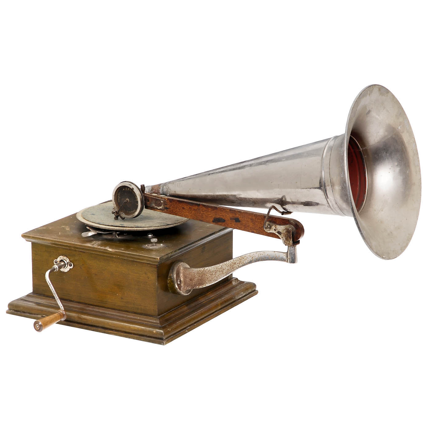 1) Probably by HMV, walnut case, witches' hat metal horn, Ø 9 ½ in., length 16 ½ in., on traveling arm, Exhibition mica reproducer, parts somewhat rusty, working. - And: 2) Unmarked, light-wood case, motor replaced, horn damaged at the neck, missing crank.