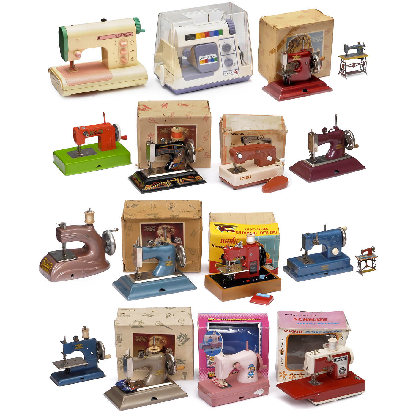 1) Four by Casige, Germany, c. 1950, lithographed or painted tin, in boxes. - 2) Sibyll, GDR, c. 1980, electric, plastic. - 3) Palitoy, England, c. 1960, lacquered metal. - 4) Cragstan, Japan, c. 1960, battery-operated, lacquered metal. - 5) Sewmate, Japan, c. 1975, battery- operated, lacquered metal. - 6) Three by Casige, Germany, c. 1955, lacquered metal. - 7) Gabriela, GDR, c. 1970, electric, plastic, without battery compartment cover. - 8) Little Modiste, Japan, c. 1958, electric, lacquered metal, wood base, in box. - 9) Regina, Germany, c. 1965, lacquered metal. - 10) Sewing Machine, Hong Kong, c. 1980, plastic, in box. - 11) Two Penny Toy sewing machines, c. 1930, lithographed tin, by Meier and Fischer, width 2 ¼ and 3 1/6 in. - 12) Seven empty boxes. - And: 13) Five tins of accessories.