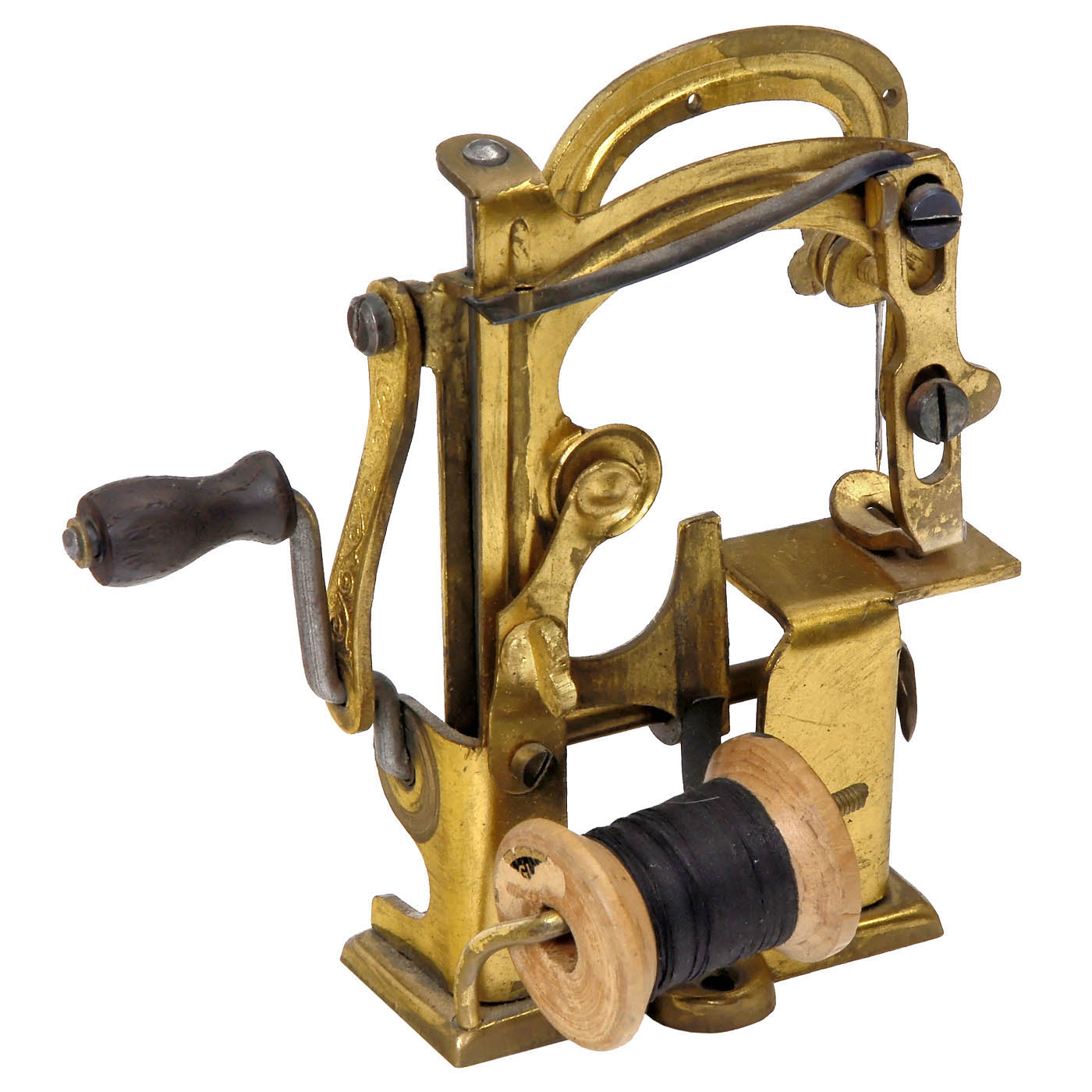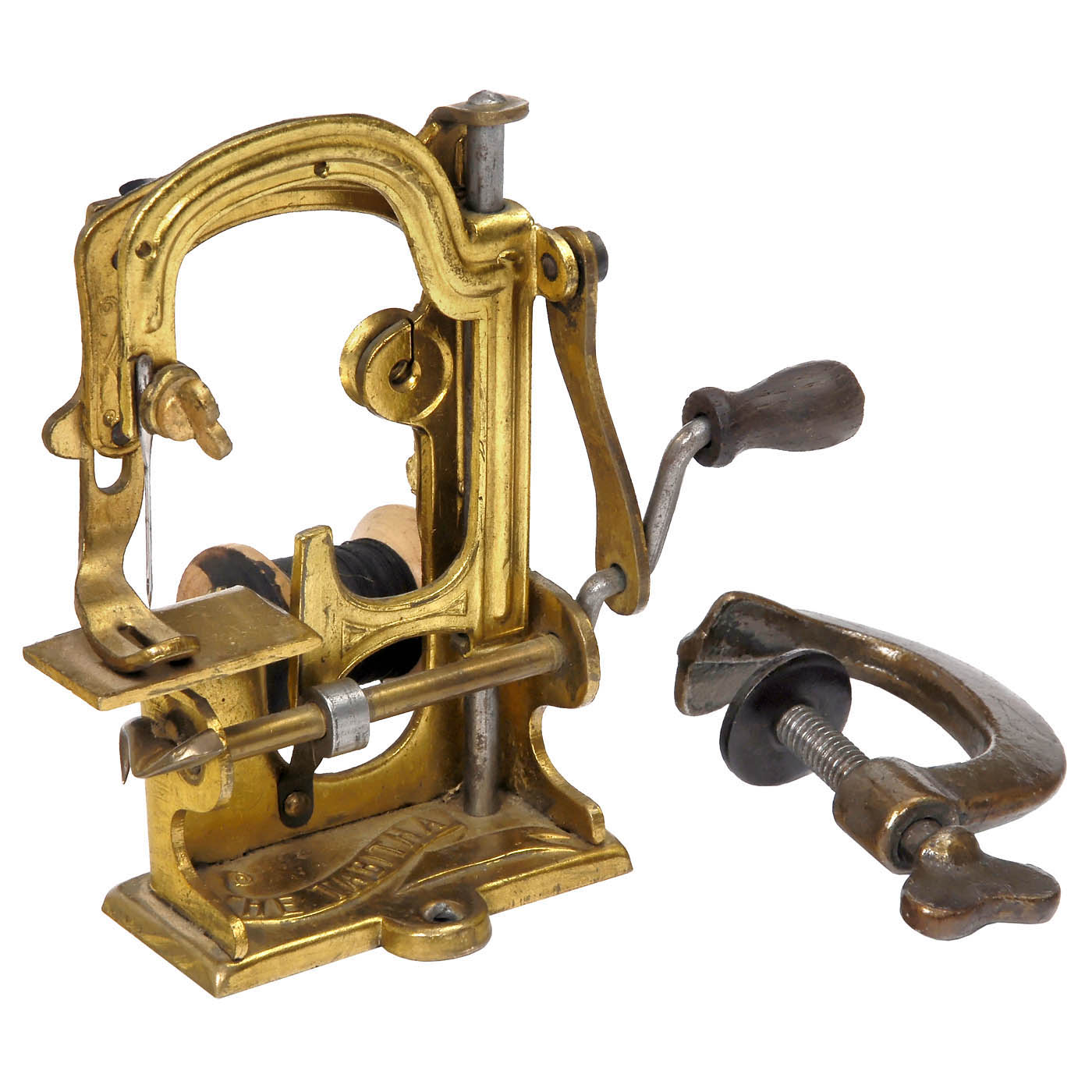 Manhattan Brass Co., New York, sold in England by Daniel Judson & Son Ltd., 77 Southwark Street, London South East, agents for Tabitha sewing machines under the name "The Popular Sewing Machine", embossed brass, hand-turned mechanism, thread spool, height 4 in., with table clamp, in damaged cardboard box, lid with parts of the instructions.
