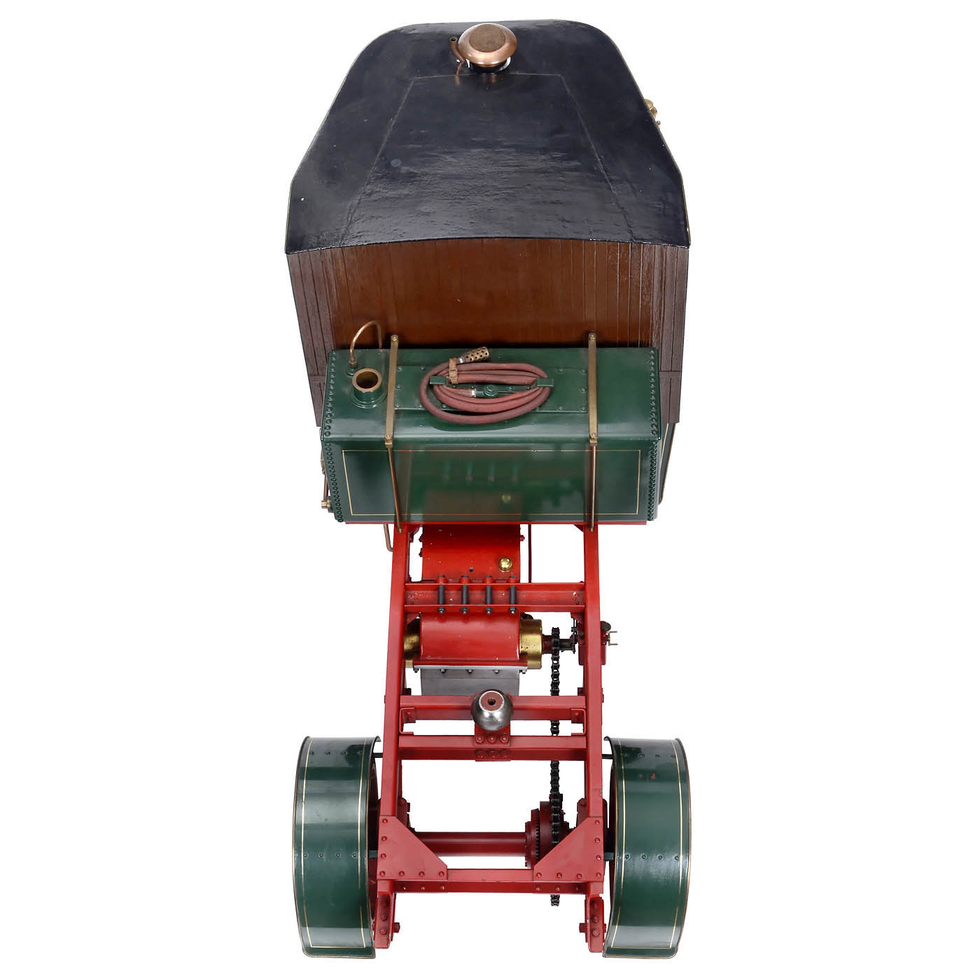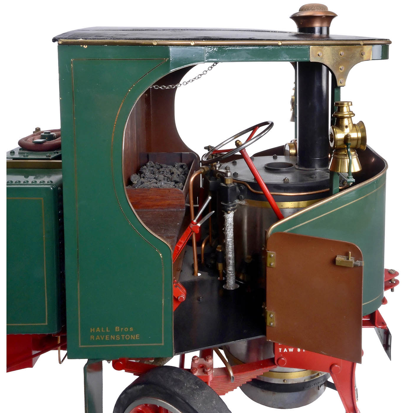 Cab with vertical coal-fired steel boiler with water glass, pressure gauge, safety valves, steam whistle and chimney, large twin-cylinder engine with chain drive to rear wheels, hand-operated gear lever, steering wheel and hinged doors, the rear with mounted water tank, chassis with leaf springs and four spoked wheels with solid rubber tyres, the front wheels steered via Ackerman linkage, finished in green with gilt pinstriping and "Hall Bros. Ravenstone Leics." in gold to front, boiler certificate through to 1984, trailer with oil or fuel steel tank, tractor unit 32 in., trailer 33 in., front and rear with license plate BH1981.