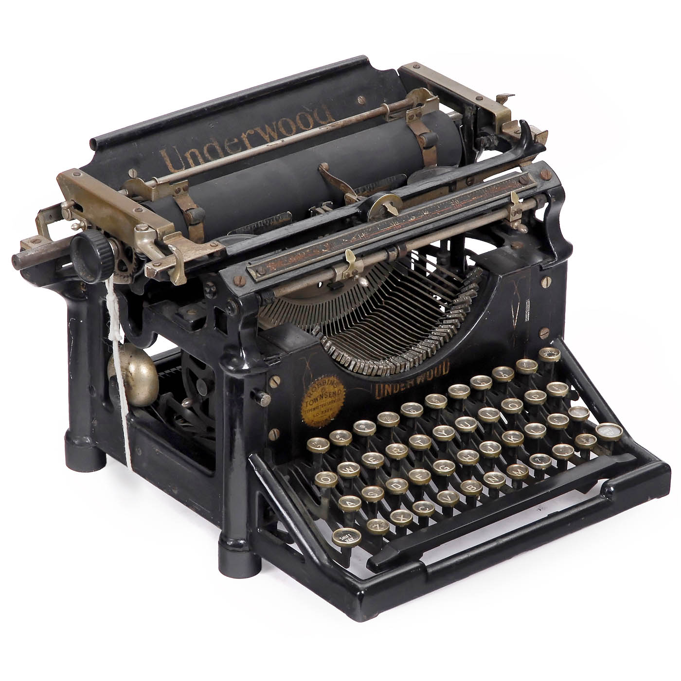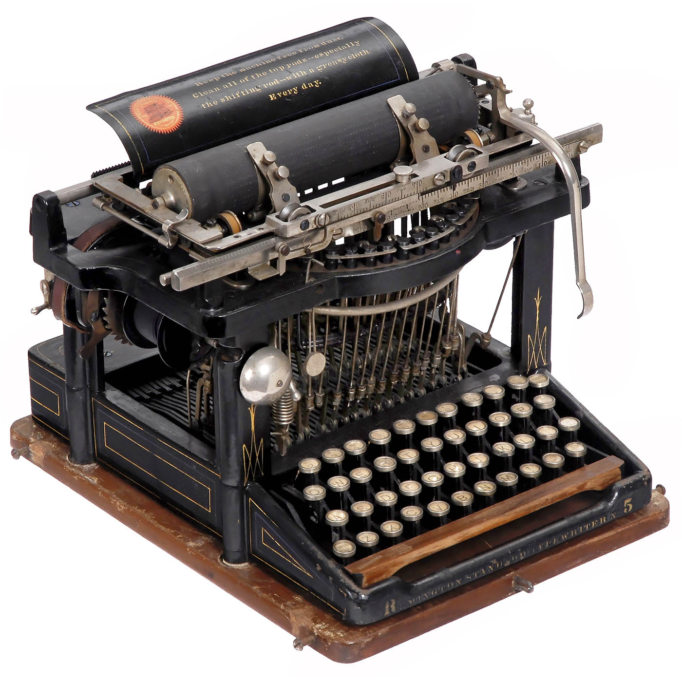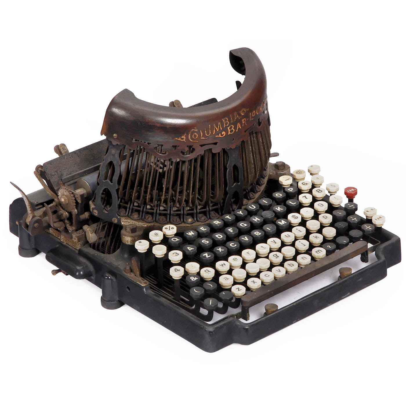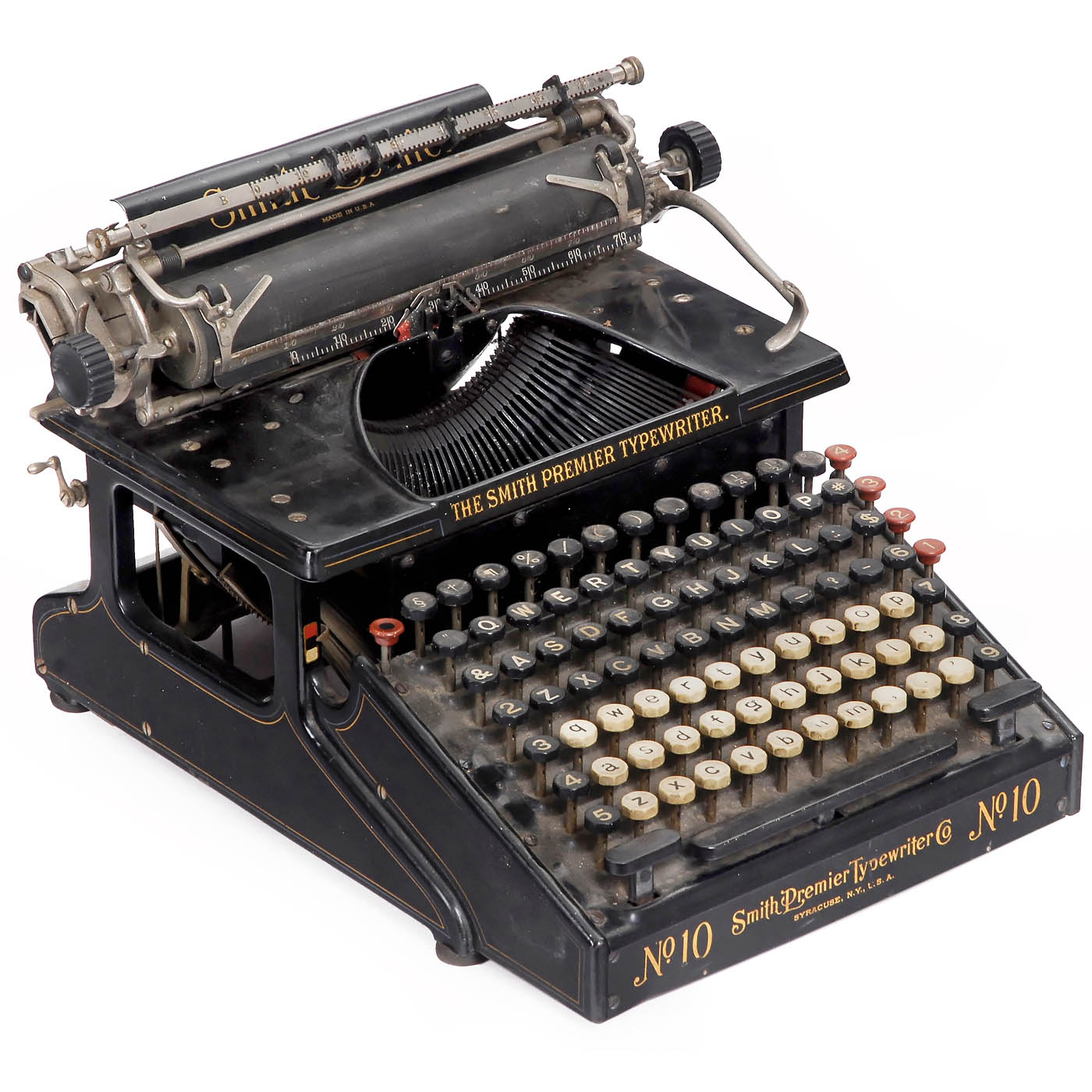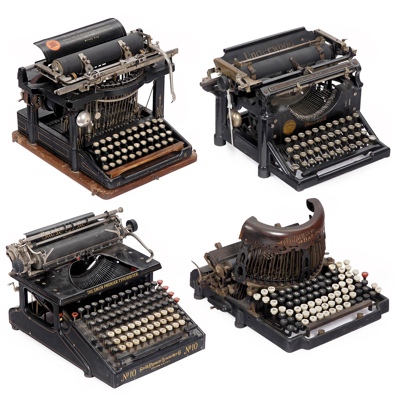 1) Bar-Lock No. 14, c. 1909, Columbia Typewriter Co., New York. American typebar machine with wonderfully decorative Art-Nouveau-styled pressed copper front plate, invented by Charles Spiro. Rusty, not working. - Literature: Martin, 1949, p. 102. (4/4) - 2) "Underwood No. 5", 1900 onwards, the most successful typewriter design in history, later almost every typewriter imitated the Underwood, mechanism a bit stiff, in need of cleaning. (3/3-4) - 3) "Smith Premier No. 10", c. 1910, Smith-Premier Typewriter Company, Syracuse, the only frontstroke typewriter with a full keyboard, 84 keys in seven rows, carriage movement defective. (3/4) - And: 4) "Remington Standard No. 5", c. 1895, upstroke machine, wood typebars, some parts loose, with tin cover and wood base. (3/4)