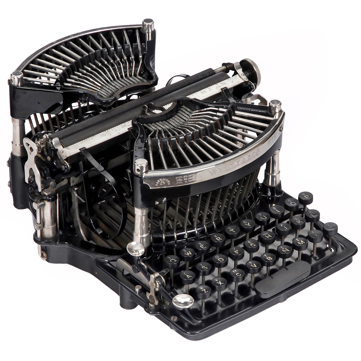 American "Grasshopper" typewriter mechanism, frontstroke, 28 keys, double-shift for 84 characters in straight keyboard, paper-feed roll behind the platen, serial no. 3425, very good optical condition, carriage train defective. - Literature: Martin, 1949, p. 128.