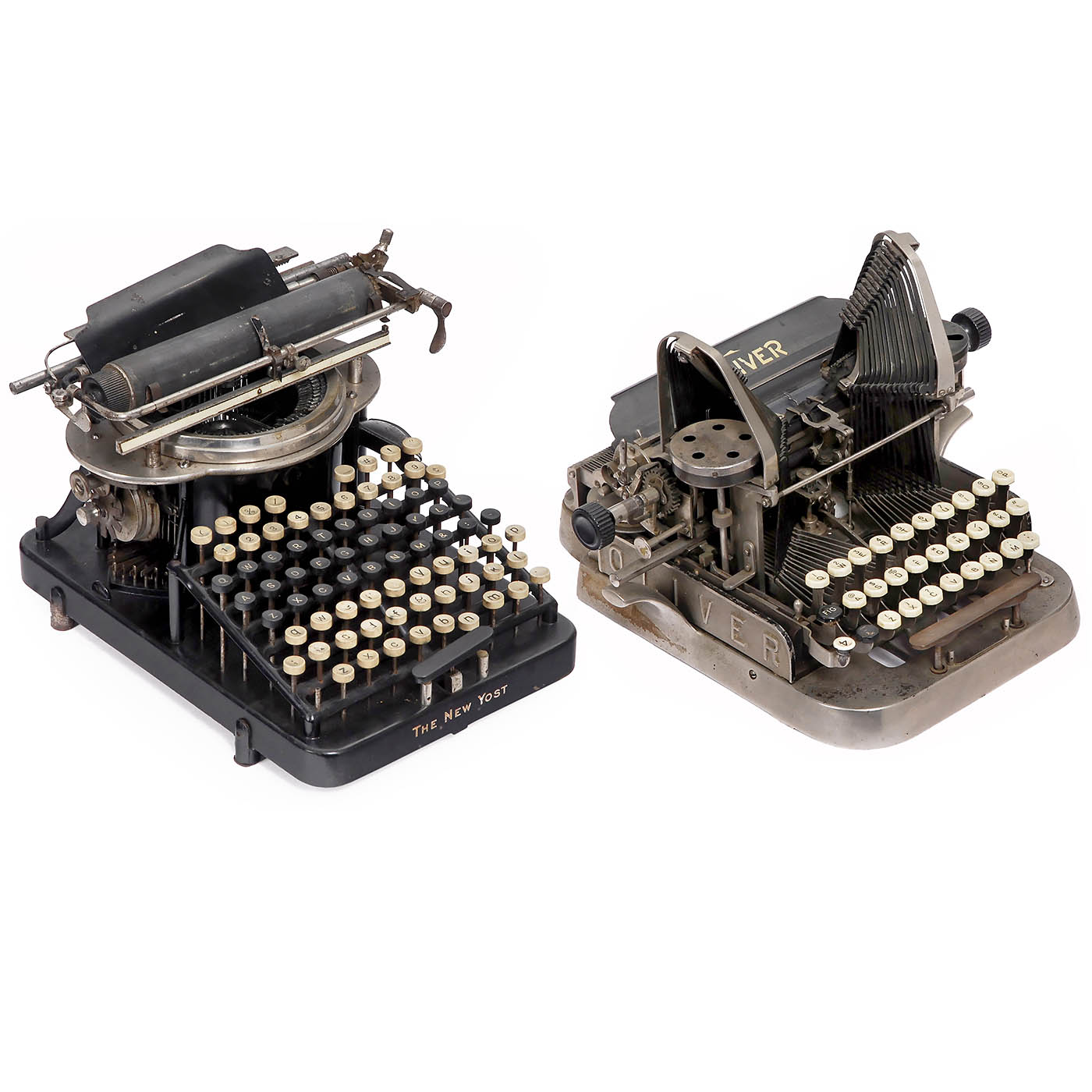1) "Oliver No. 2", 1897, no. 6085, popular American front-stroke machine, keytops replaced, mechanism stiff. (3/5) - And: 2) "The New Yost", c. 1895, no. 20778, American upstroke machine, circular ink pad, one type bar sticks, paper table loose. (3-4/4)