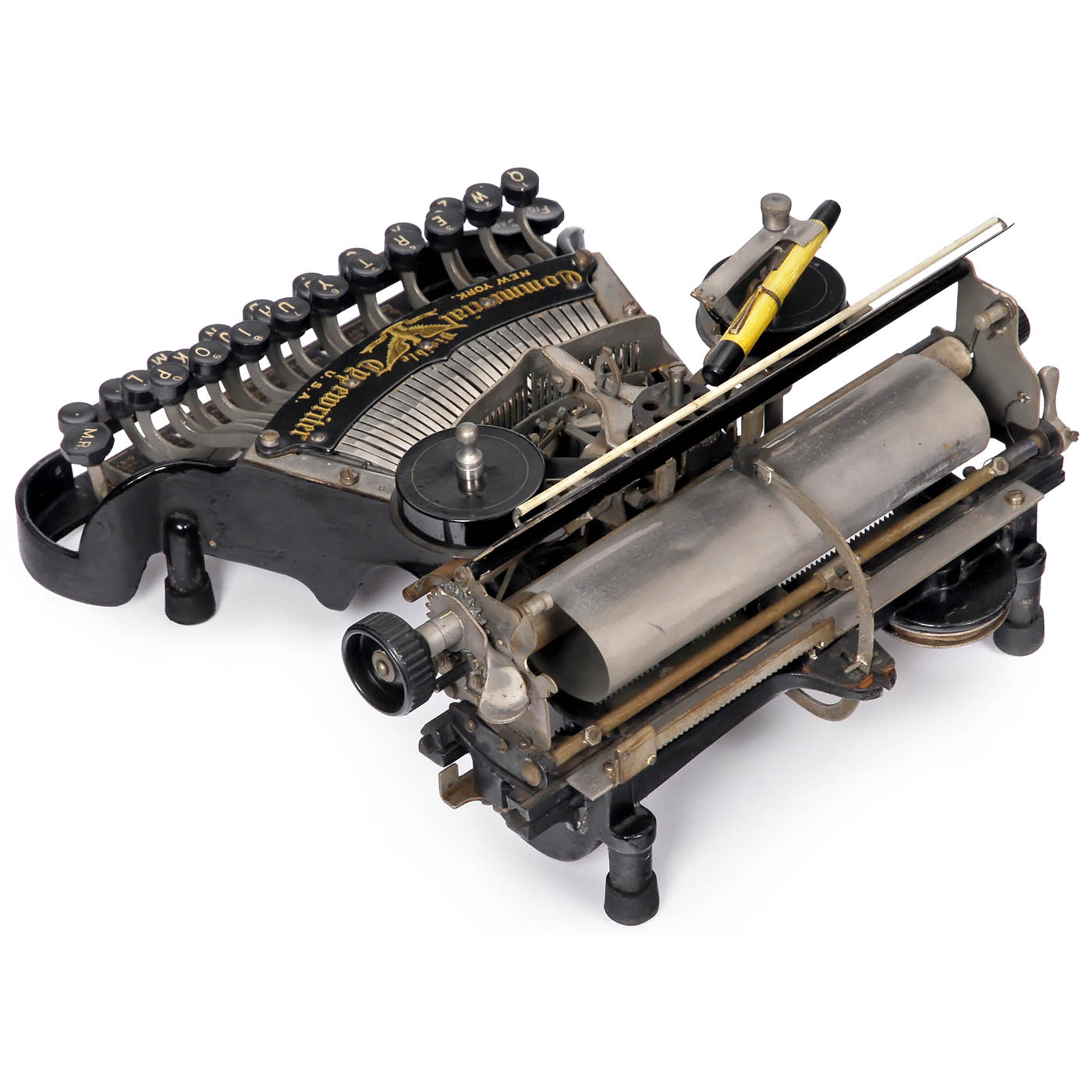 Serial no. 22865, typewheel with three rows of characters, rear-mounted hammer stroke, with flat metal fountain pen-holder on top of left-hand ribbon spool for marking horizontal or vertical lines on paper, in wood case. - One of the most attractive turn-of-the-century typewriters and, with its "wasp waist", one of the most feminine as well. - Literature: Martin, 1949, p. 165. - A desirable collector’s item.