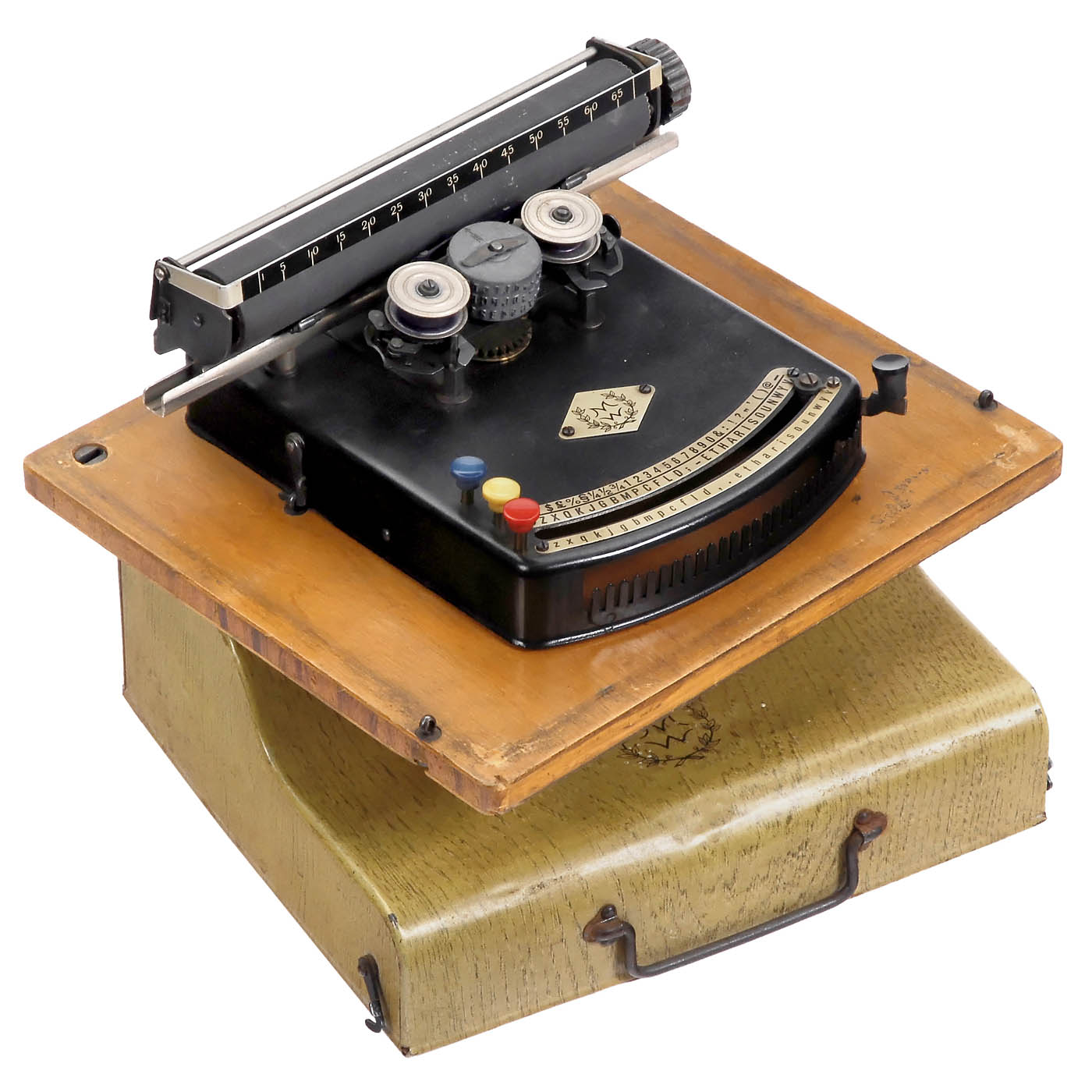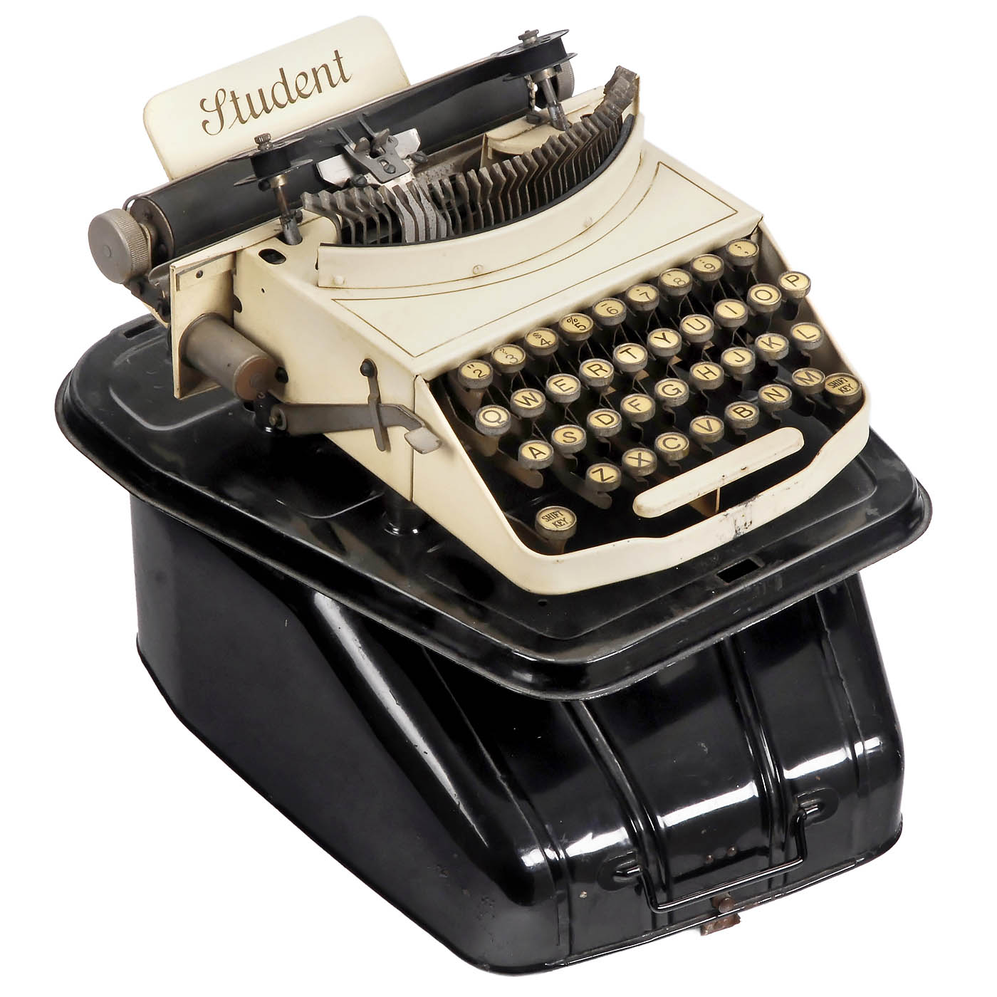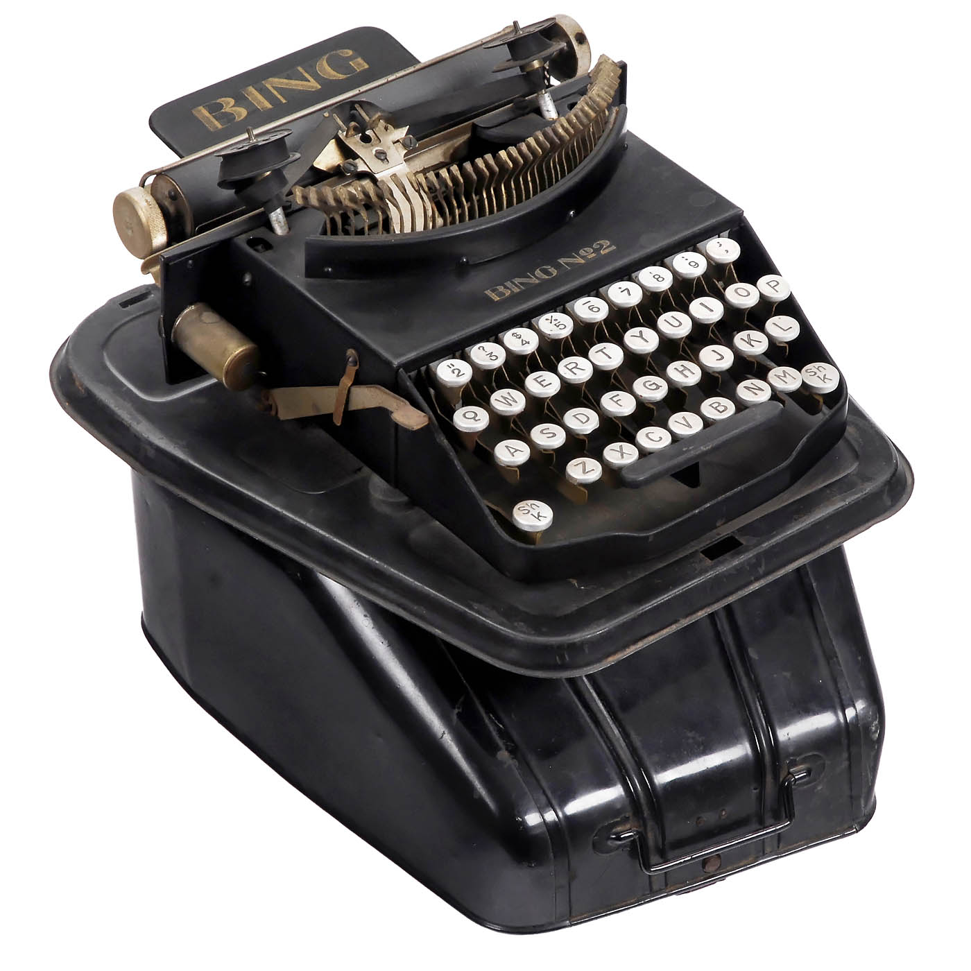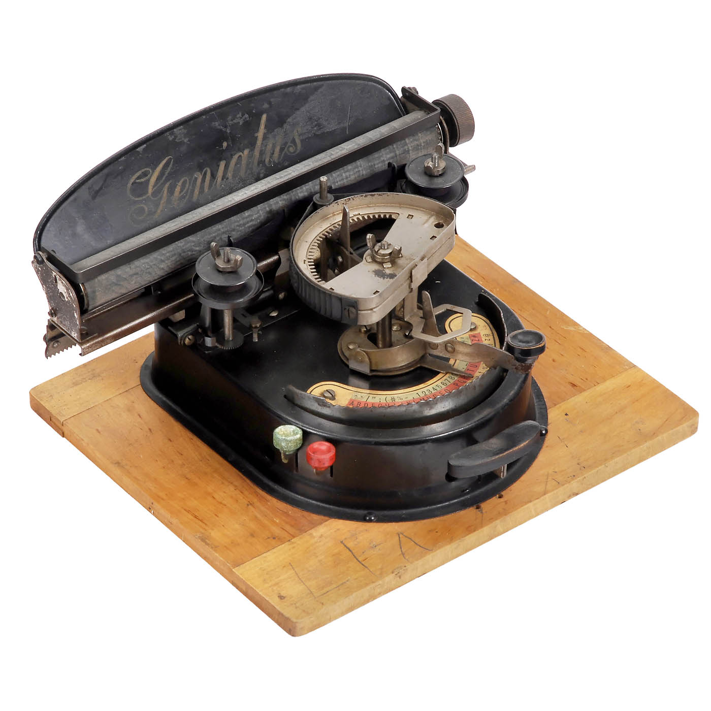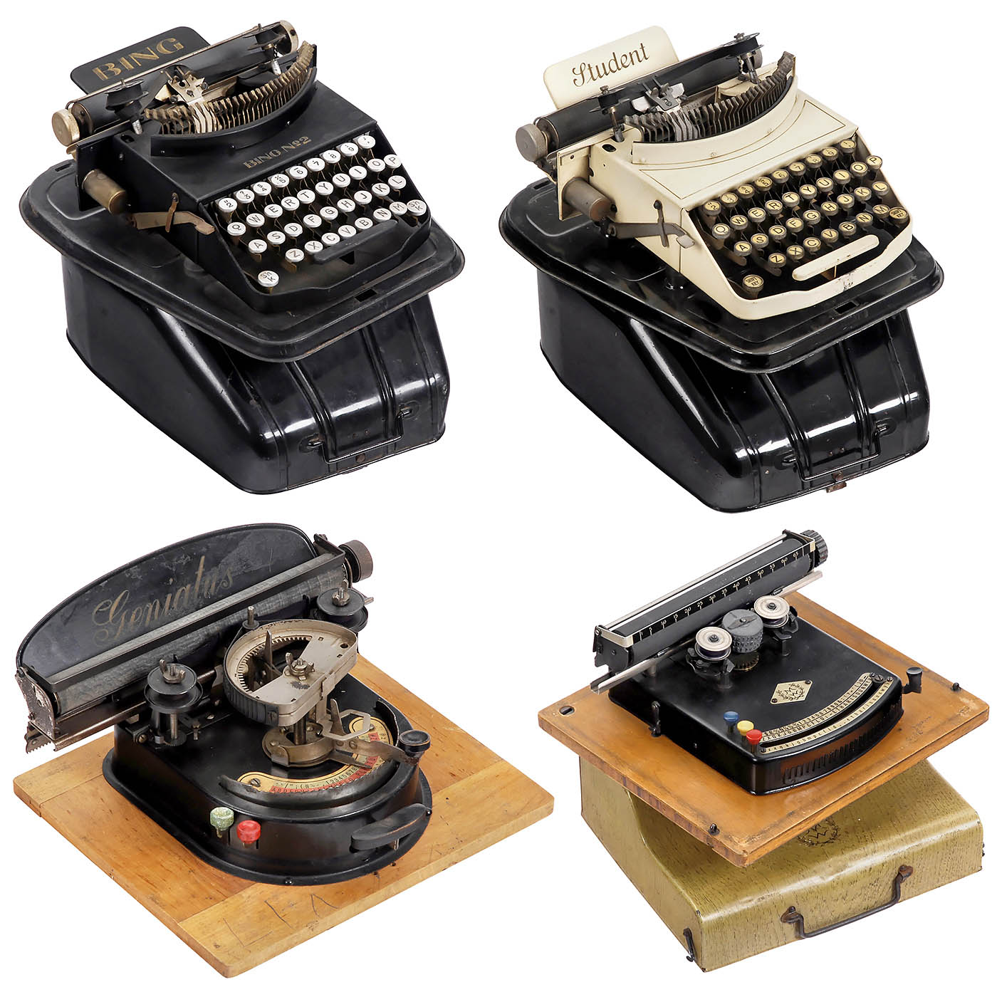 1) Gundka (M-W), 1924, type-cylinder machine with index pointer, serial no. 14388, with tin cover, in good condition, works. (2-3/2) - 2) Geniatus, 1928 onwards, with semi-circular index card and swinging sector, works, somewhat stiff. - Literature: Martin, 1949, p. 330. (3/3) - 3) Bing No. 2, Bing Werke A.G., Nuremberg, tinplate case and base, QWERTY keyboard, aluminum keytops, works, 1927 onwards. (3/3) - And: 4) Anfoe Student, c. 1928, nearly identical in construction to Bing No. 2, beige-lacquered case, QWERTY keyboard layout, keytops with metal rings, works, with tin cover. (3/2-3)