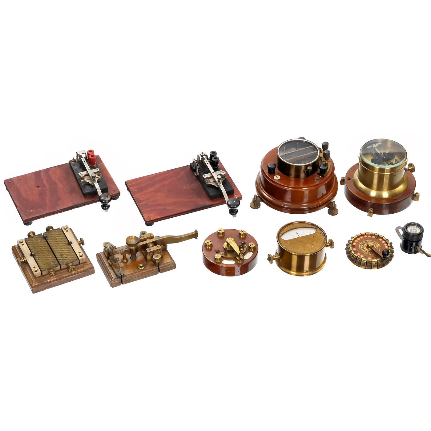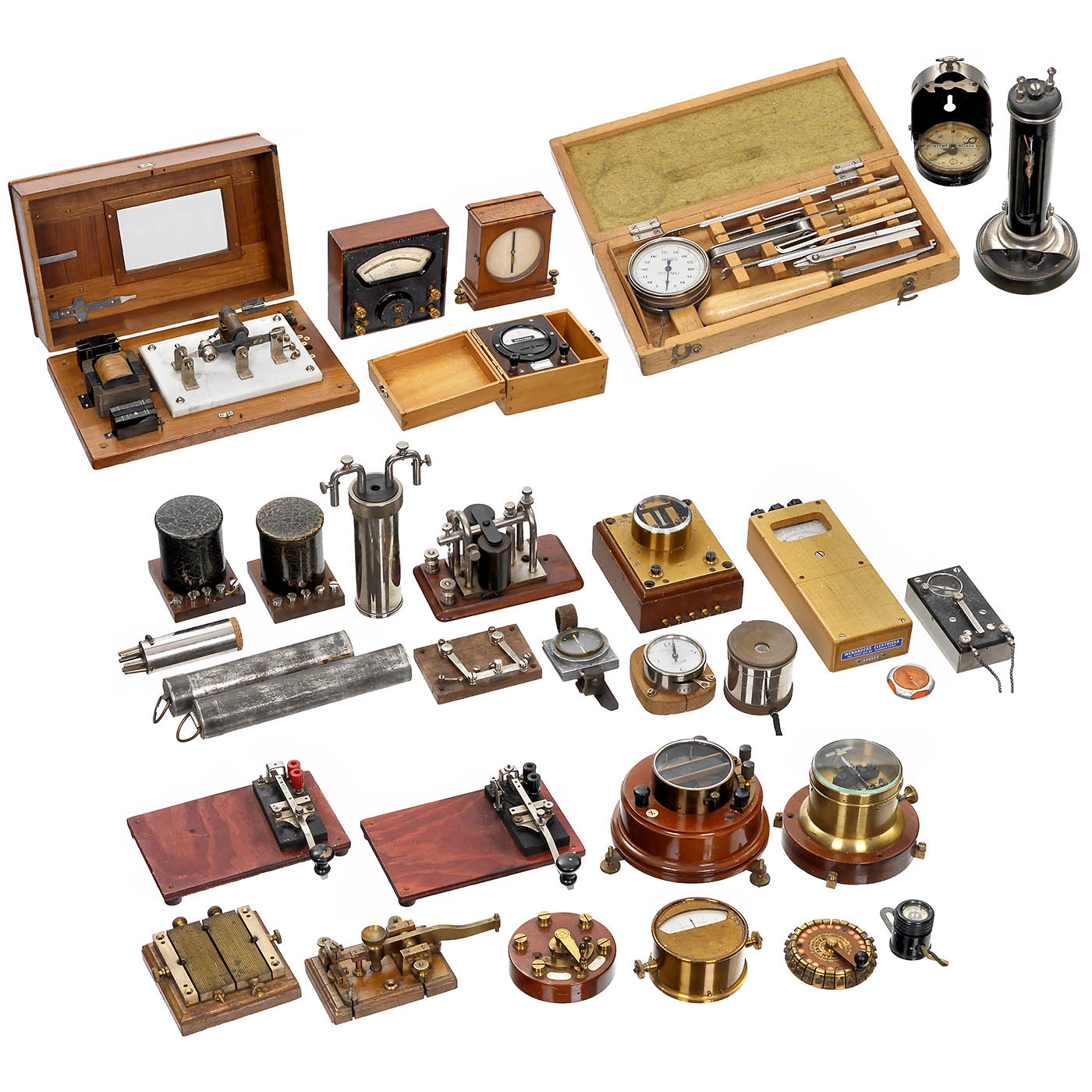 1) Large wall box with "buzzer" by Ericsson, with glass window. - 2) Battery tester, in leather case. - 3) Cutaway model of a Bell-type telephone receiver. - 4) Three Morse keys. - 5) Three pocket compasses, one marked "Bézard-Kompass". - 6) Two galvanometers in mahogany cases. - 7) Four meters, one frequency, one milliampere, one ohm and one volt. - 8) Telur telephone clock. - 9) Two relays, brass and mahogany. - 10) A sounder. - 11) Box of precision mechanic's tools, marked "L.M. Ericsson". - And: 12) Twelve additional items.