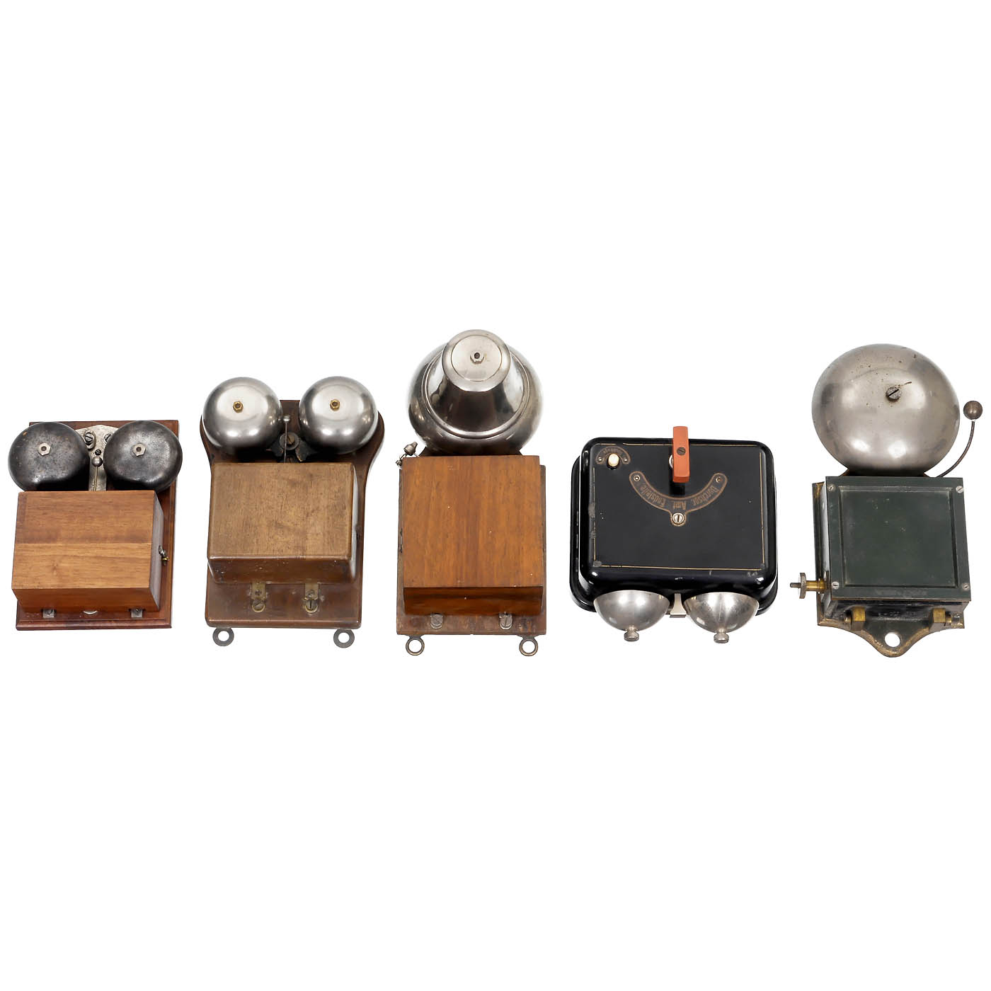 Single and double bells by W. Gurlt and others, in sheet metal, wood and cast-metal cases.