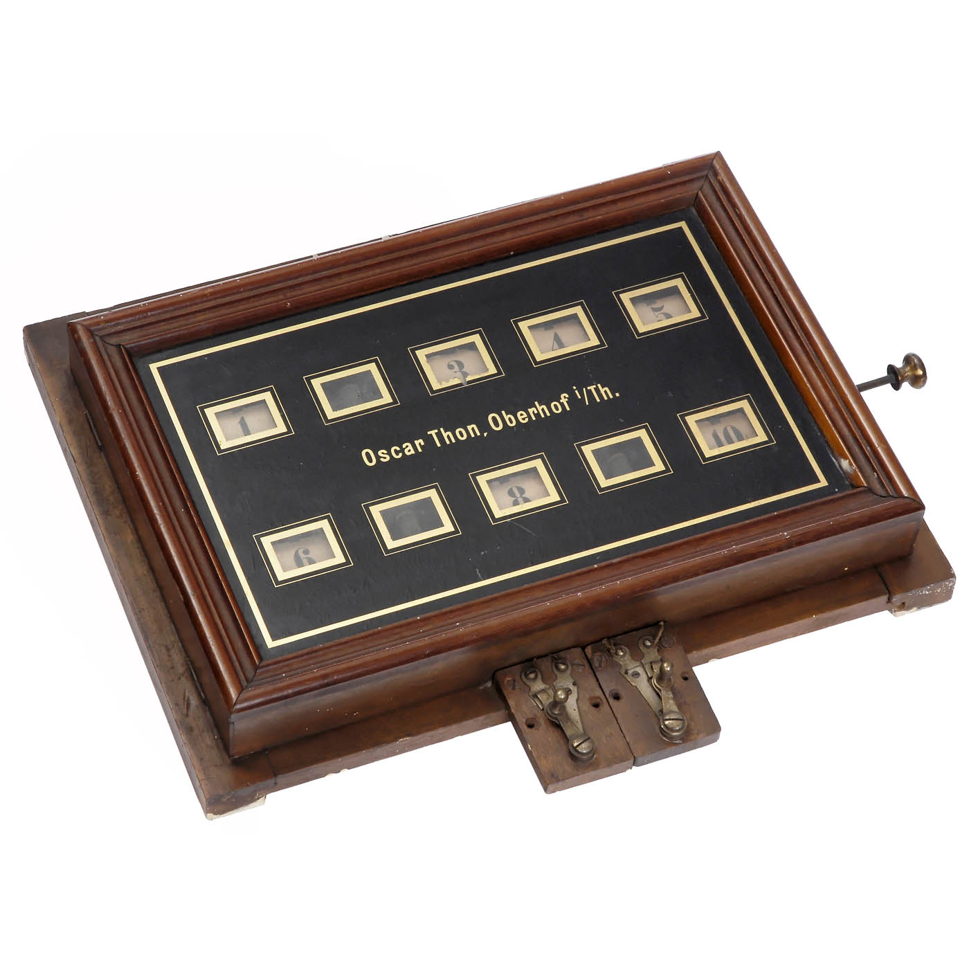 1) Table station, walnut case, eight switches, crank inductor, handset with speaking horn. - 2) Table station, metal case, twenty-four switches, crank inductor (crank missing), handset with speaking horn. - 3) Table station, walnut case, ten switches, handset with speaking horn. - And: 4) Hotel call, manufacturer: Oscar Thon, Oberhof, ten flaps, with reset lever.