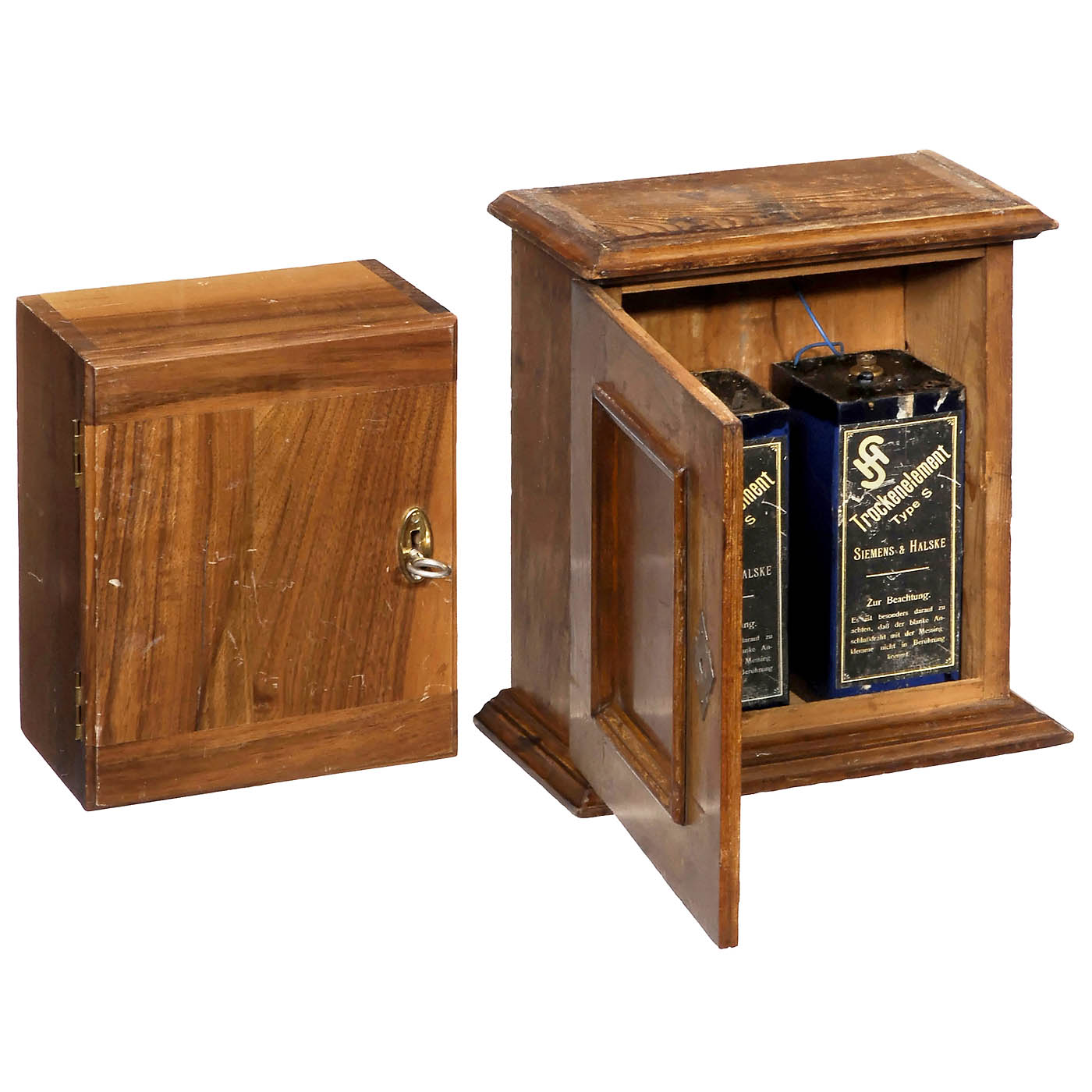 Friedrich Reiner, Munich. 1) Wall telephone, walnut case, missing upper part, three-part crank inductor, double bell, carbon grain microphone with speaking horn, on adjustable support, two Bell-type receivers. - 2) Double bell. - 3) Upper case of a wall station, not complete. - 4) Battery box, probably reproduction. - 5) Double bell by Friedrich Reiner, polished walnut case. - And: 6) Battery box, with two Siemens & Halske dry elements.