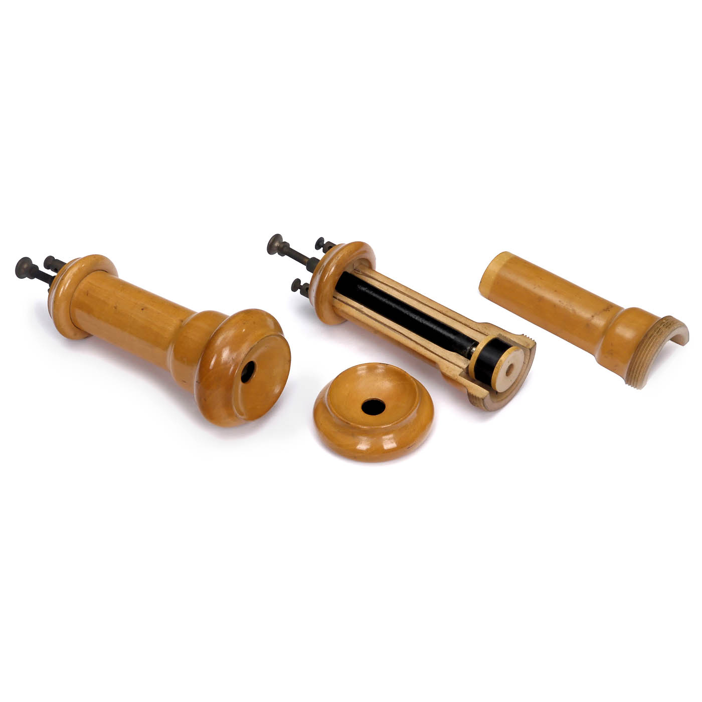 Unmarked, butterstamp telephone, turned wood, for speaking and listening, with rod magnets, height 6 in. each. One telephone can be dismantled to demonstrate the technique.