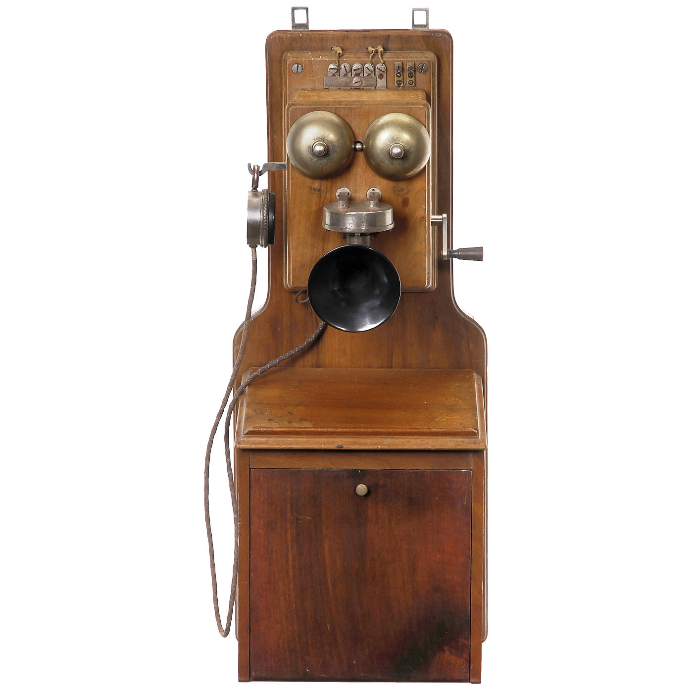 Unmarked, Berliner-type microphone with speaking horn, earphone, 3-part crank inductor, writing desk, battery compartment with 2 Siemens & Halske type S dry cells.