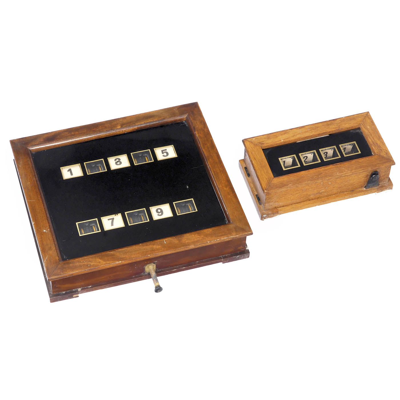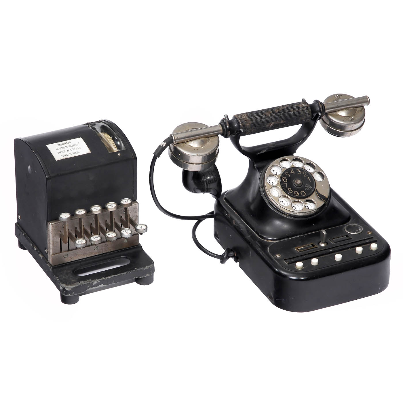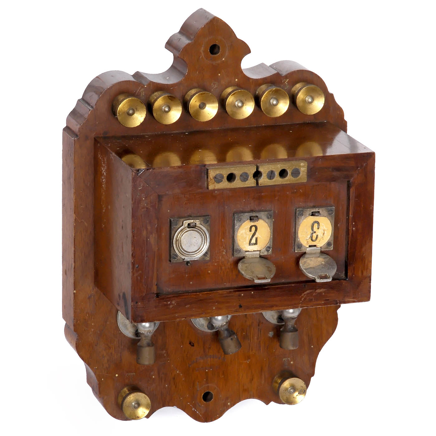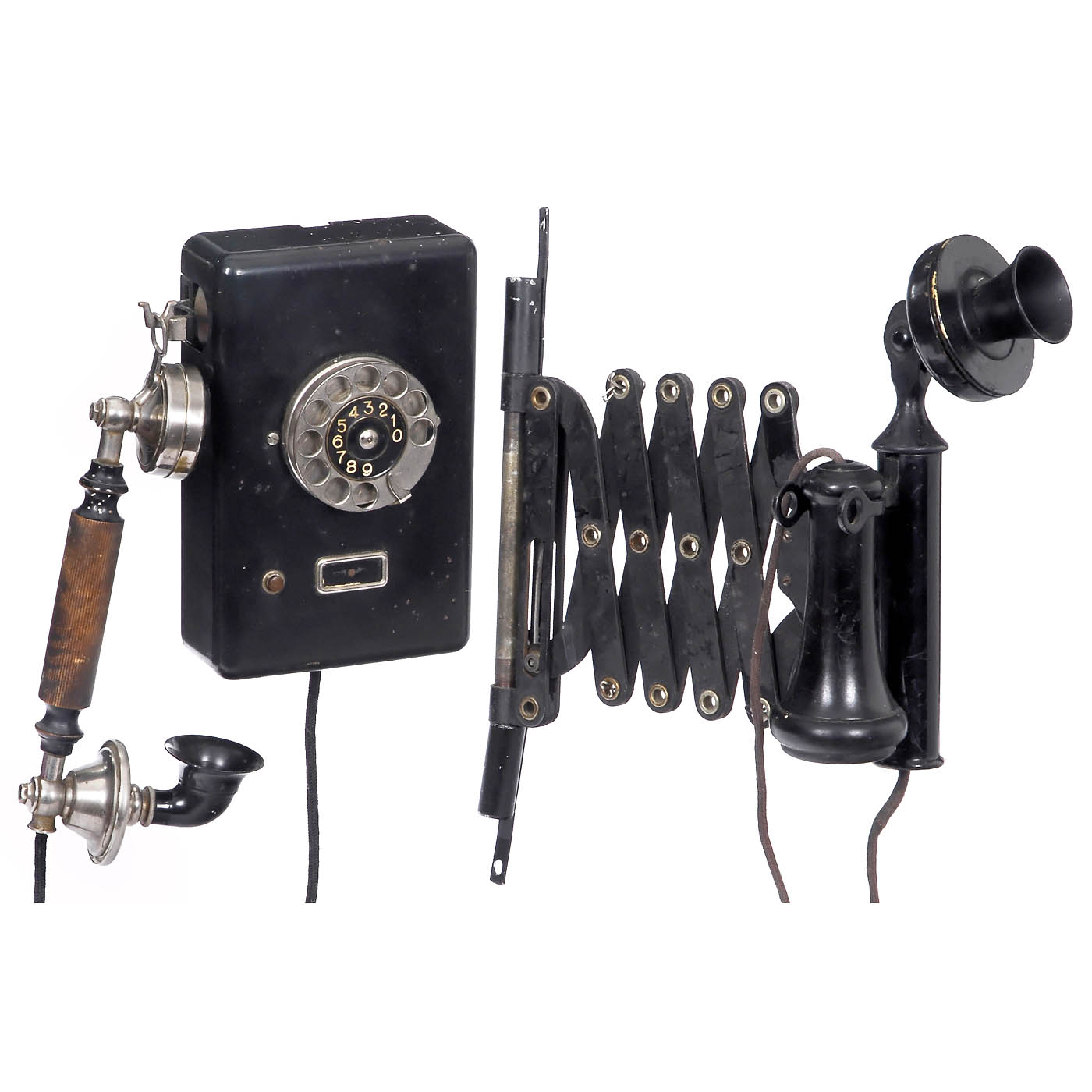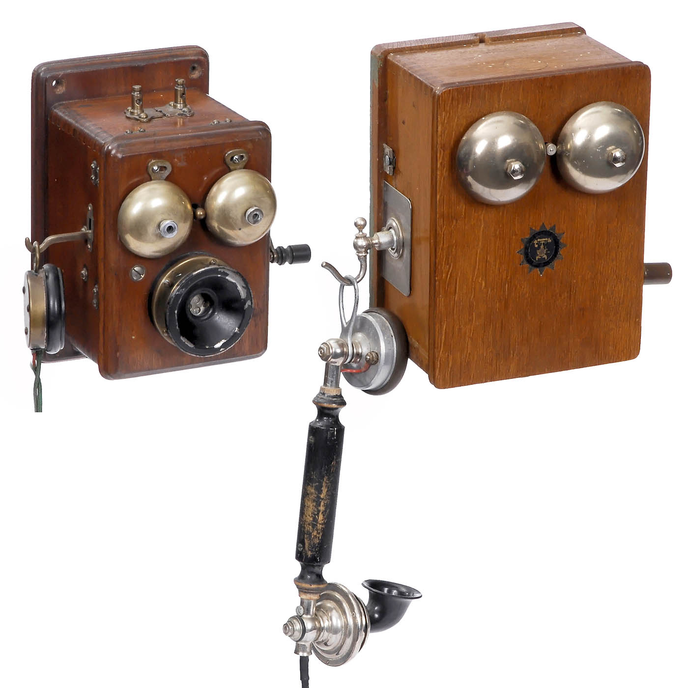 1) Ericsson, Sweden, oak case, double bell, crank inductor, handset with speaking horn. - 2) Unmarked, probably Germany, walnut case, crank inductor, double bell, microphone with speaking horn, can receiver. - 3) Telegrafverkets Verkstad, metal case, dial, handset with speaking horn. - 4) Siemens & Halske, metal case, dial, six switches, handset with speaking horn (probably replaced). - 5) Number switch with typewriter keys, manufacturer unknown, probably USA, metal case, cast base. - 6) Candlestick telephone on scissor mount, probably Western Electric, microphone with speaking horn, bakelite Bell-type receiver. - 7) Ericsson, small switchboard, for three lines, walnut case. - And: 8) Two hotel room telegraphs, one for ten, the other for four rooms.