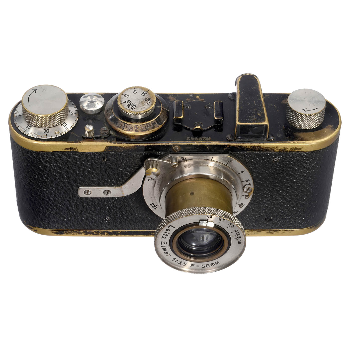 Leitz, Wetzlar. No. 9943, with Elmar 3,5/50 mm. Dimpled release button. The strong abrasion of the black paint makes the camera interesting! The lens cap has the same patina. The baseplate has weak incisions.