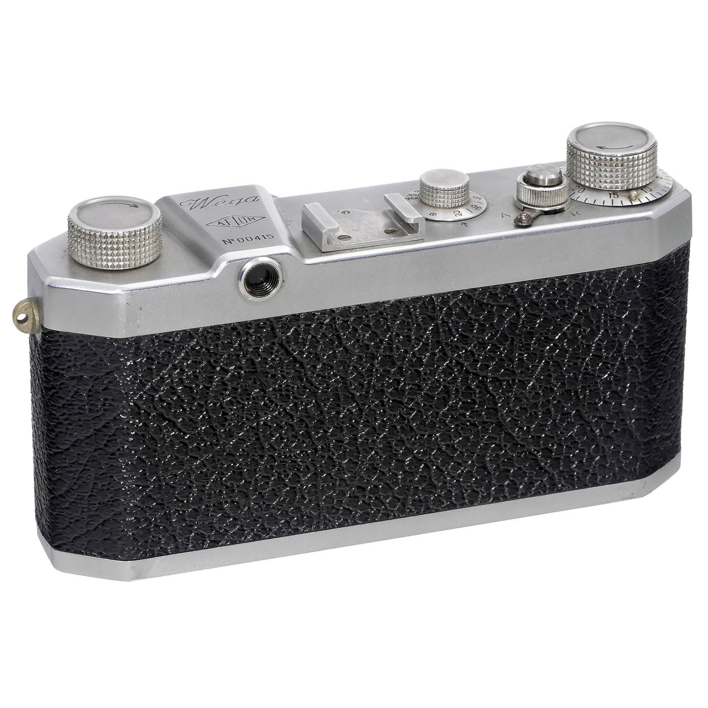 AFIOM, Italy. No. 00415, shutter 1/20-1/1.000 sec., B, shutter works, but do not open. With interchangeable lens for M39 screw-mount Anastigmat Trixar 3,5/50 mm. With original Wega lens cap. Right carrying lug missing. In nice condition!