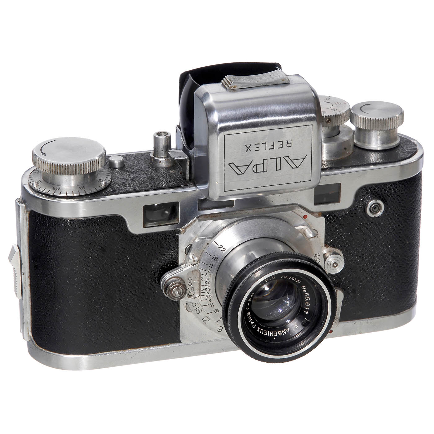 Pignons, Switzerland. No. 20426, coupled rangefinder works, shutter long times work, on short times the curtains do not open, with Angenieux Alpar 2,9/5 cm, no. 85617, glass clean. Synchronization like model 4.
