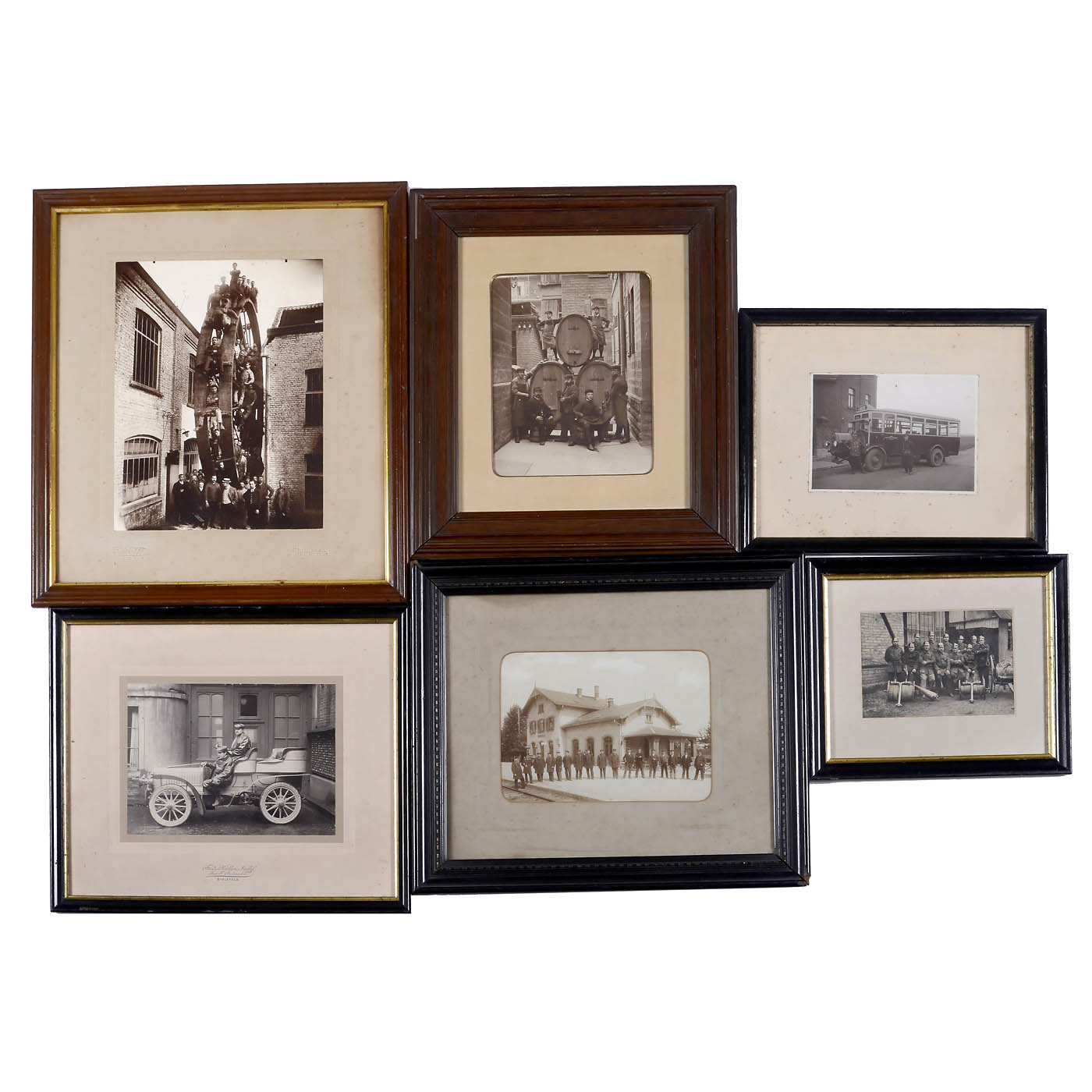With passe-partouts and frames. 1) Bus driver and conductor, in front of a bus of the Kölner-Straßen-Omnibus-Gesellschaft bus from the "Kalk-Mühlheim-Flittard" line, picture size 7 x 5 in. - 2) Twelve firemen, with hose reels and hand extinguisher, picture size 6 ¼ x 4 1/3 in. - 3) Factory workers, Belgium, proudly presenting their assembled wheel, picture size 9 x 11 2/5 in. - 4) Automobile drivers, in four-seated touring car, picture size 9 ½ x 6 ¾ in. - 5) Railway officials and workers, in front of the railway station in Grötzingen near Karlsruhe, picture size 8 ¾ x 6 ¼ in. - And: 6) Coopers, presentation of three finished wine barrels, picture size 6 ¾ x 8 ¾ in.
