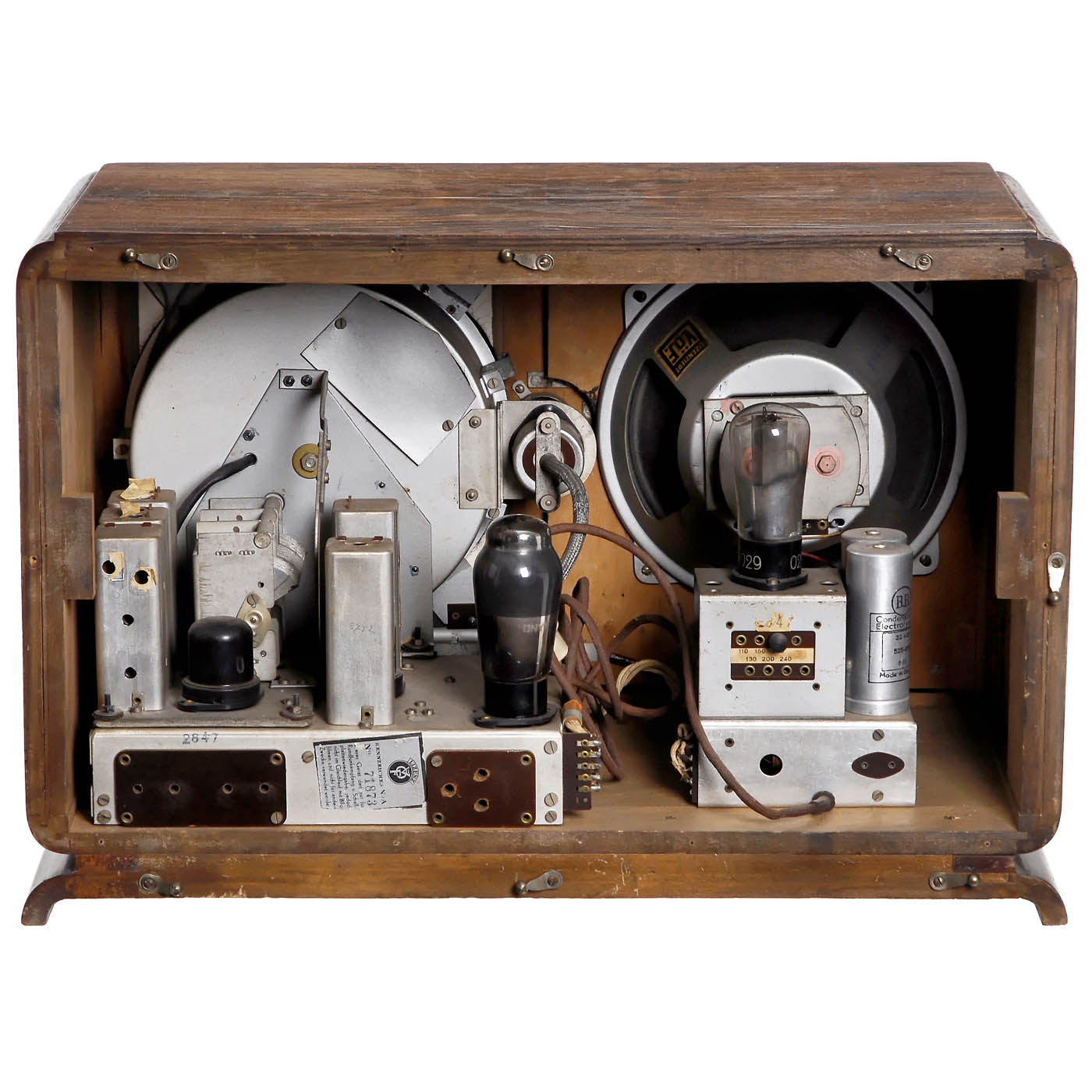 Elektrotechnische Fabrik Ing. Ludwig Neumann GmbH, Vienna. Five tubes, long wave, medium wave and short wave, mains operation (110-240 volts), built-in loudspeaker, magic eye, tuning indicator with glow stick, scale with country names, illuminated points of the set transmitter, wood case (very small chip on veneer), complete with tubes and back panel.