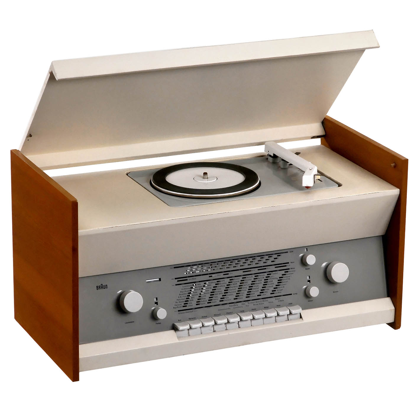Braun, Frankfurt. Radio receiver and record player, 110-240 volts AC, long wave, medium wave and FM, for external speaker, record player with four speeds, white-lacquered wood case with ash-veneered sides, lid without locking mechanism, otherwise good condition, working, potentiometers need cleaning.