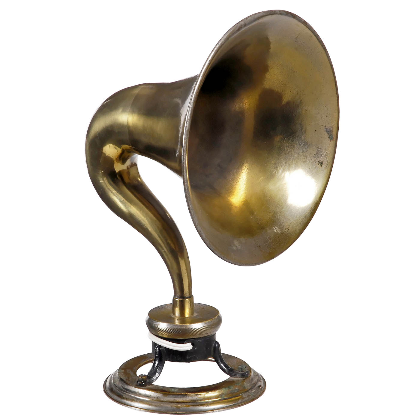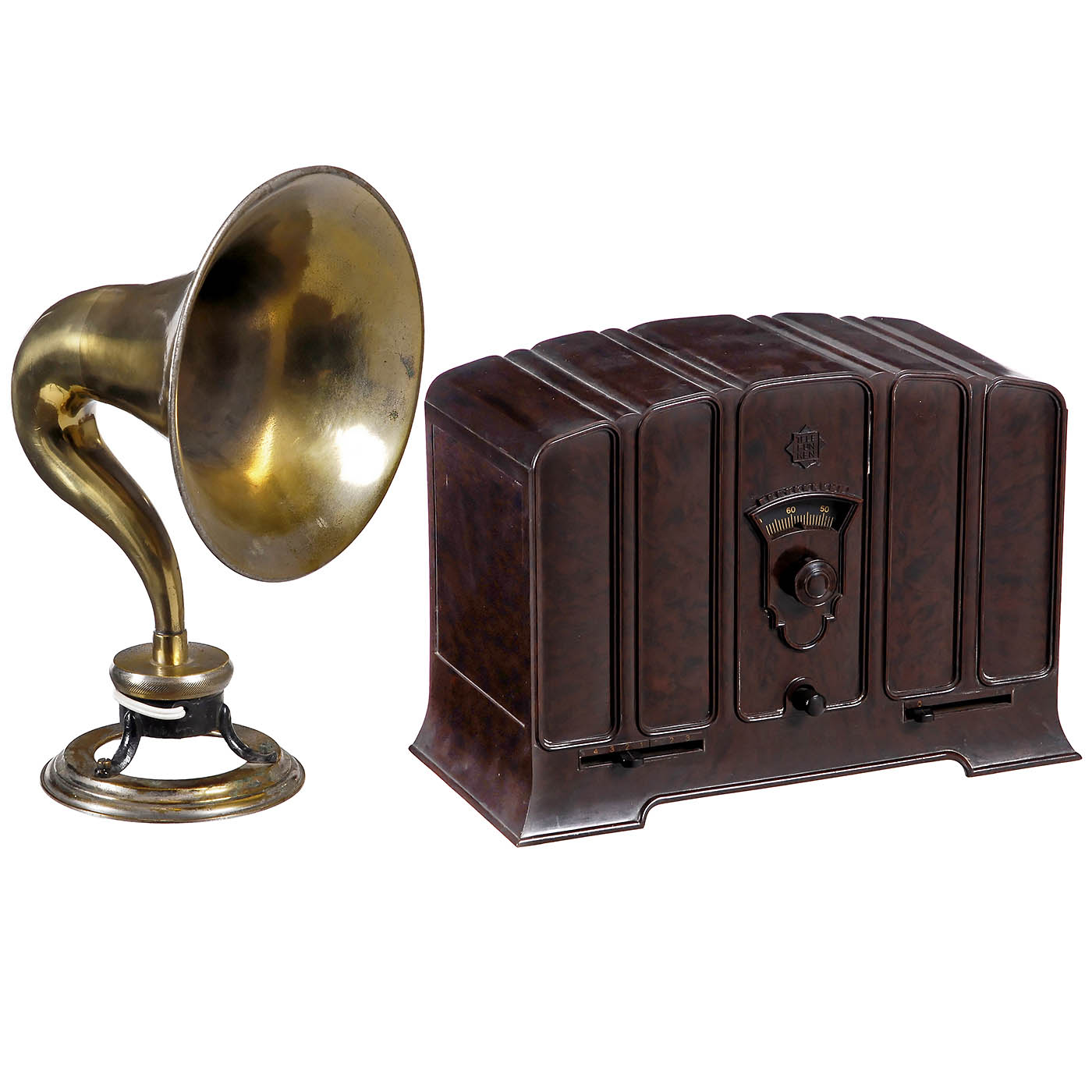 1) Model 122W, Telefunken Germany (TFK), three tubes, long wave and medium wave, 110-240 volts AC, for external speaker, complete with tubes and back panel, bakelite case in good condition. - And: 2) Small horn speaker, unmarked, brass, height only 12 ½ in. - A very decorative combination.