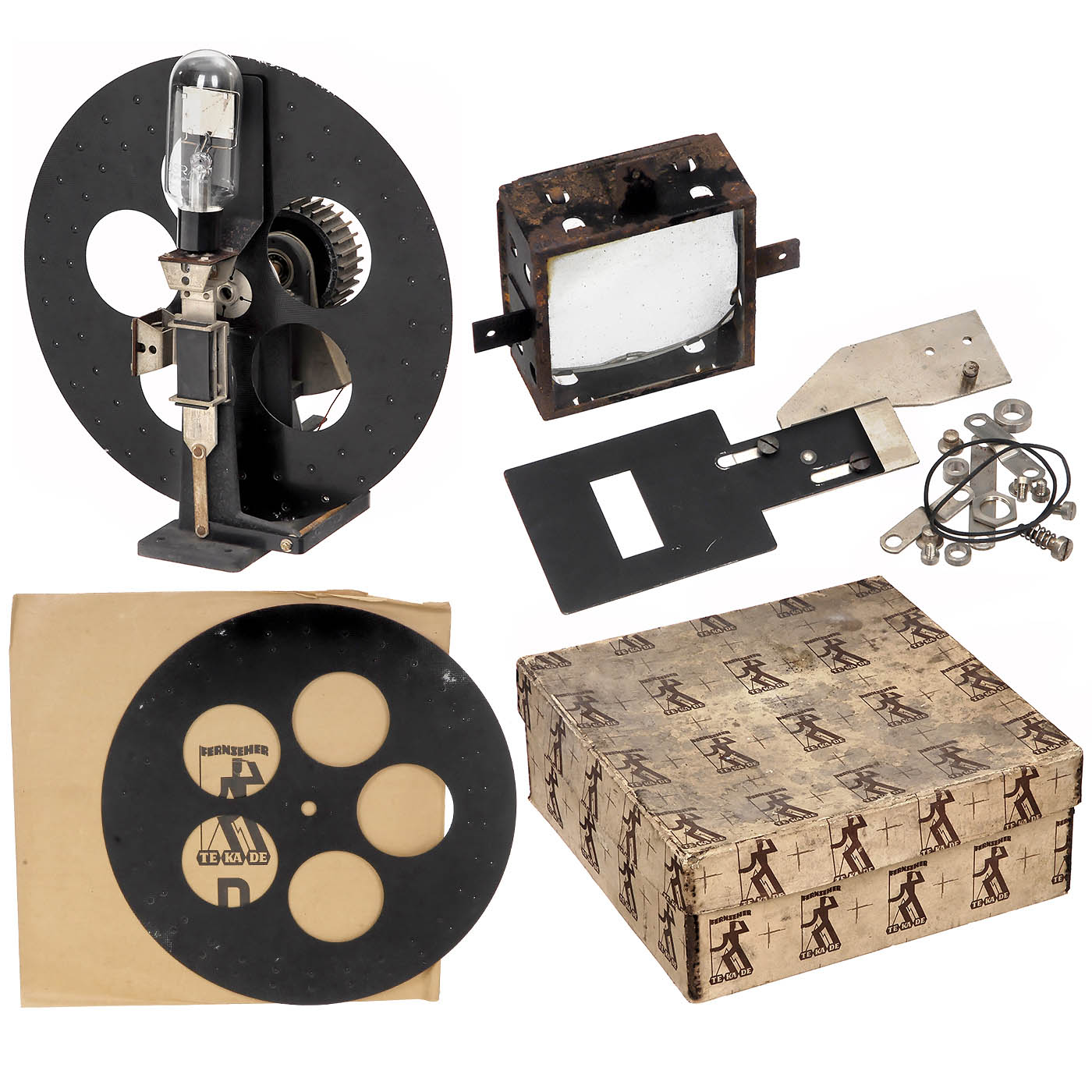 By "TeKaDe". Telehor universal receiver, consisting of bearing block with axle and phase adjustment, two lamp holders with aperture, Osram Telehor AU television lamp (surface glow lamp) and two Nipkow discs (one for the horizontal 4:3 TeKaDe format and one for the vertical Baird format) and viewing lens, audio wheel with age-related damage, otherwise in good condition, in original box!