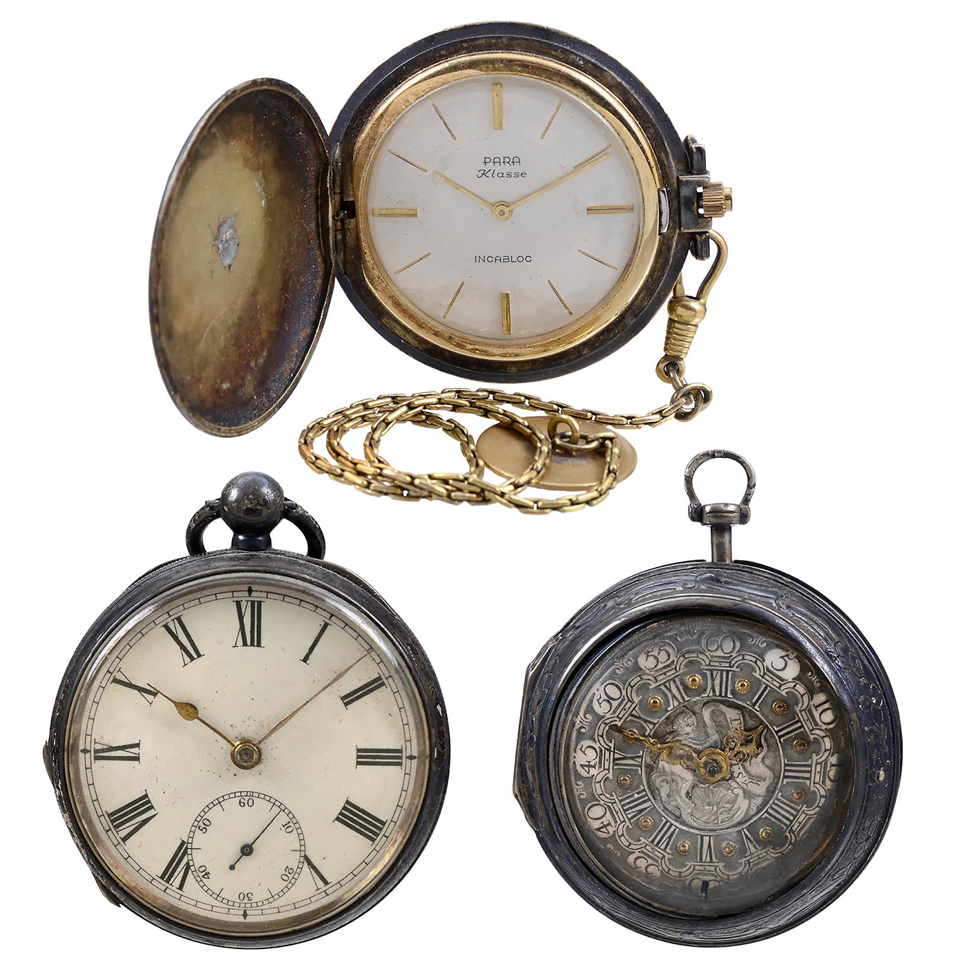 1) Tarts, Londo. Pair-cased pocket watch, mid-18th century, no. 25417, sterling silver case with repoussé outer case, London hallmarks, key-wind fusee movement, pierced and engraved balance cock, silvered regulation, silvered dial with Roman chapter and outer Arabic minutes, gilt hands, in need of repair. - 2) Waltham, USA. Made for the English market, movement no. 3892106, c. 1888, silver case with Birmingham hallmarks, enameled dial, subsidiary second dial, in need of cleaning. - And: 3) Para Klasse Incabloc pocket watch with chain, c. 1950, spring cover, crown winding, in need of repair.