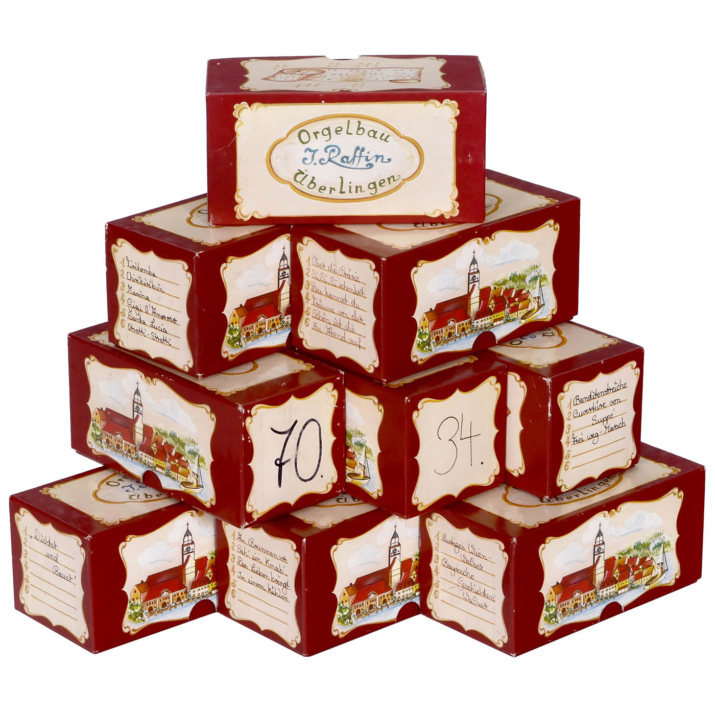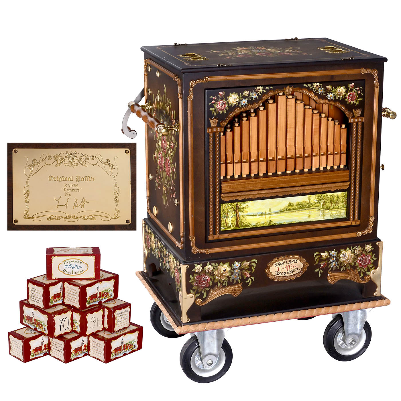 Orgelbau Josef Raffin in Überlingen, Germany. 31 notes, 84 pipes with 4 optional stops, basses: 5 basses 8`, 5 basses 4`, accompaniment: 10 bourdon 8`, melody: 16 concert flute 8`, 16 bourdon 8` beat, 16 violin 8`, 16 wood piccolo 4`. Roll-operated, hand-cranked, second rewind crank, all sides of the case hand-painted, excellent playing condition, with 10 music rolls.