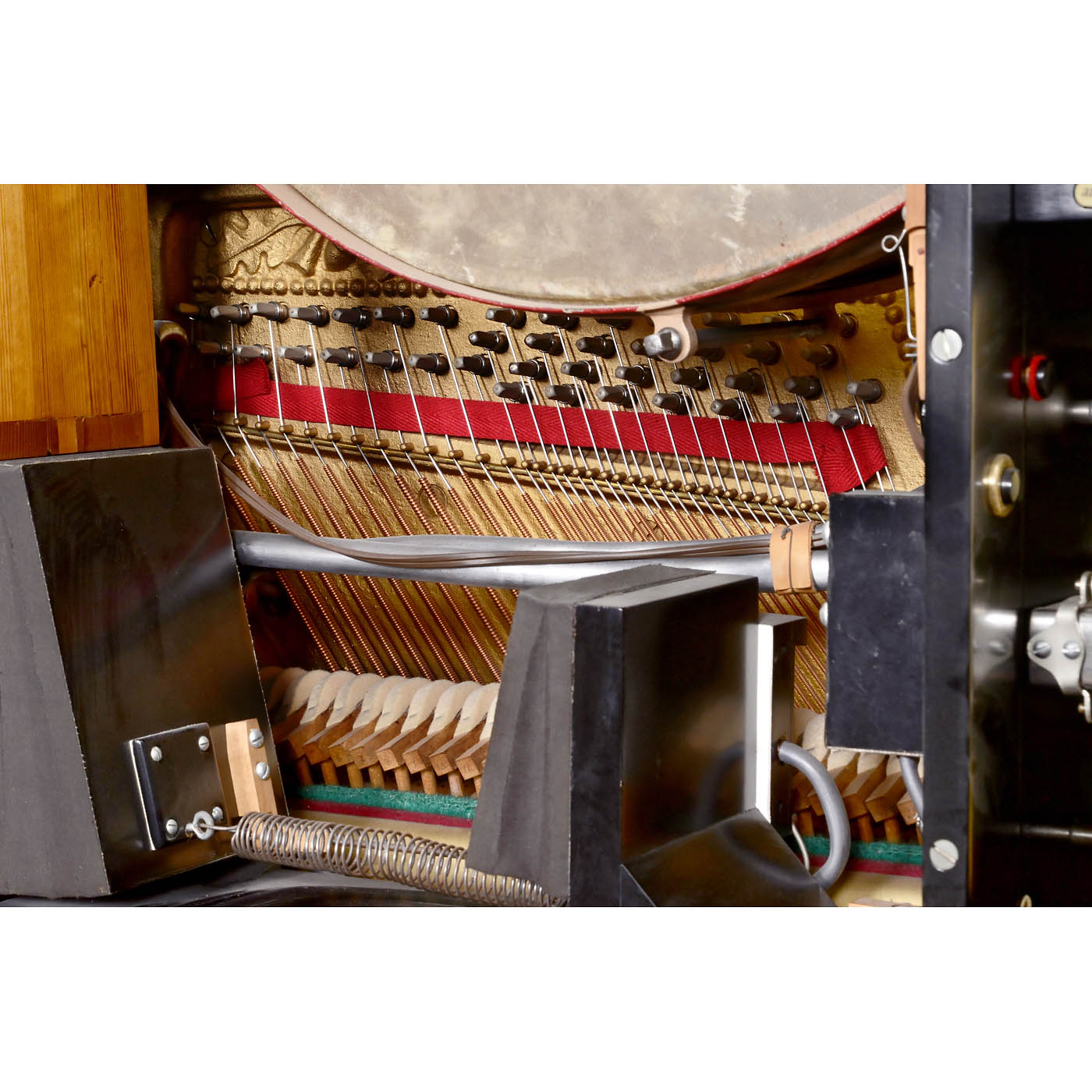 Ludwig Hupfeld AG, Leipzig. Orchestrion with keyboard piano, violin-cello pipes, ten-note orchestra bells, mandolin and drums, upright wood case with later glazed front (panel for viewing the fascinating mechanism), 62 x 30 ¾ x 74 in., 230 volts AC electric motor, separate coin-box, excellent restored playing condition, with three Helios rolls. - Only a few examples of this small Helios type are known.