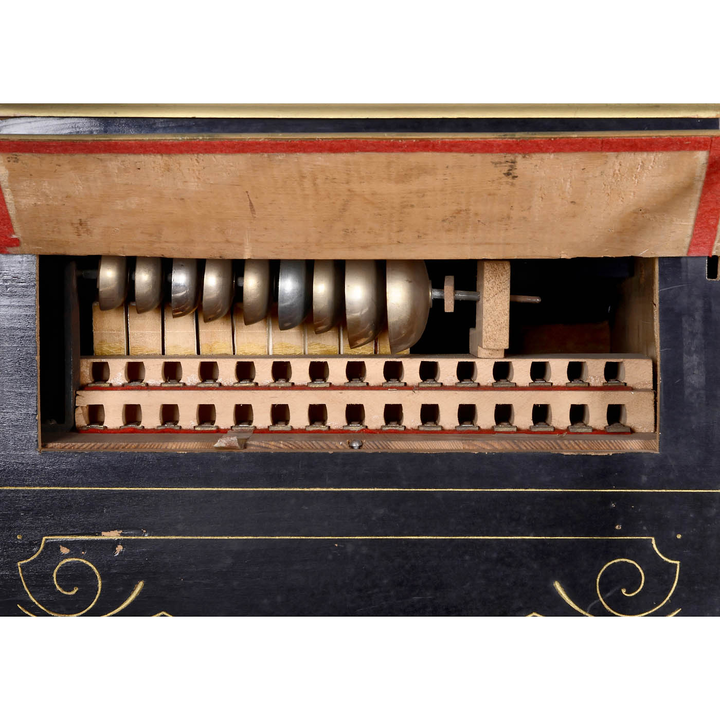 Organette, apparently exclusive to the Holzweissig catalog (1892), with sixty reeds, eighteen bells and thirty notes, for 10 ½ in. wd. card books, hand-turned, ebonised wood case with gilt highlights, on matching base, untested, very rare.