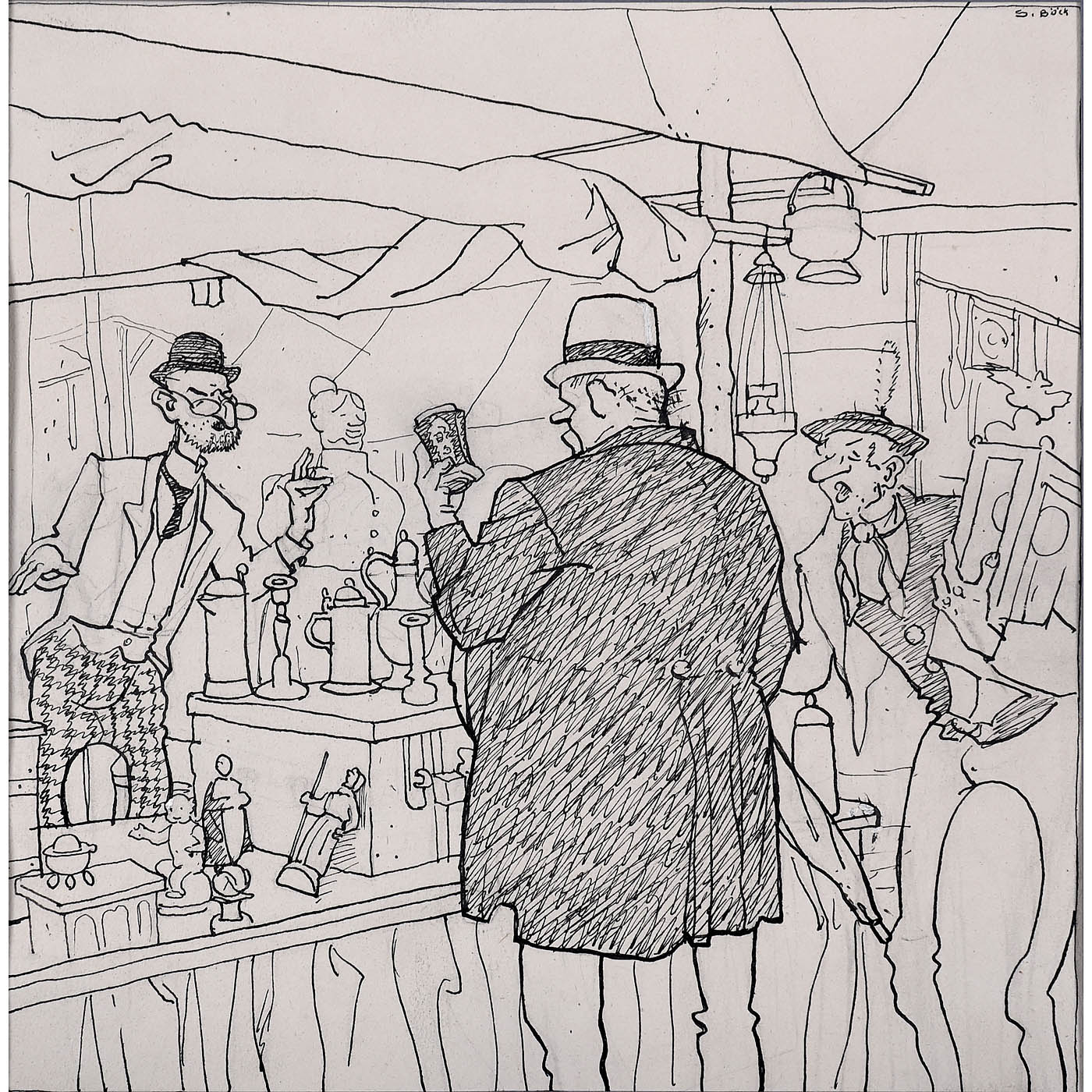 1) Eugen Nanz (1887-1958), hand-colored proof, c. 1915, signed by the artist, no. 1331C, for the Meggendorfer Blätter, 16 x 16.5 cm. - 2) Hugo Frank (1892-1962), watercolor pen-and-ink drawing, 1922, "Signore Bambino", publisher's stamp on verso, 22 x 16 cm. - 3) Watercolor pen-and-ink drawing, unsigned, c. 1925, "Fairground stalls", 24 x 32 cm. - 4) Pahr, colored pencil drawing, c. 1920, "Moritatensänger", 13.5 x 18 cm. - 5) Hugo Frank (1892-1962), pen-and-ink drawing, 1943, "Dieses Universalmittel hilft", for the Fliegende Blätter, publisher's stamp on verso, 10.5 x 7.5 cm. - 6) Siegfried Böck (1887-1958), pen-and-ink drawing, 1923, "Flohmarkthandel", no. 1681/7904, for the Meggendorfer Blätter, verso with publisher's stamp, 18.5 x 19 cm. - 7) R. Zink, pen-and-ink drawing, c. 1915, "In Liebe", for the Meggendorfer Blätter, publisher's stamp on verso, 14 x 12 cm. - 8) Adolf Oberländer (1845-1923), proof, c. 1923, "Kaufmann und Spitzbuben", for the Fliegende Blätter, 31 x 20 cm. - 9) Martin Claus (1892-1975), pencil drawing, signed, 1932, "Hippodrom", for the Fliegende Blätter, publisher's stamp on verso, 19 x 21 cm. - 10) Hugo Frank (1892-1962), pen-and-ink drawing, c. 1935, "Wurfbude", for the Fliegende Blätter, publisher's stamp on verso, 13 x 10 cm. - 11) Josef Mauder (1884-1969), pen, ink and brush drawing, 1934, signed, "Die Dame ohne Unterleib", for the Fliegende Blätter, 22 x 16.5 cm. - And: 12) Johann Baptist Maier (1881-1957), hand-colored proof, c. 1920, "Beim Trödler", for the Meggendorfer Blätter, 17 x 22 cm.