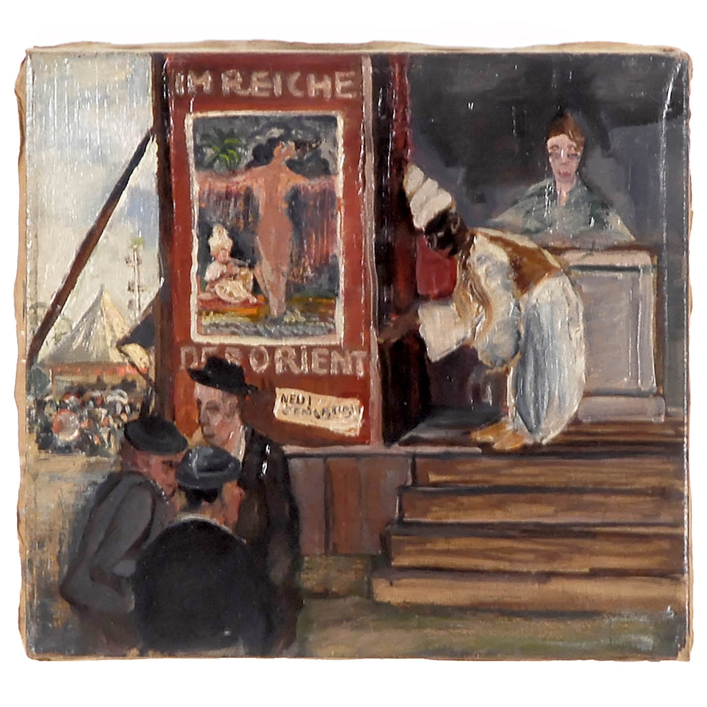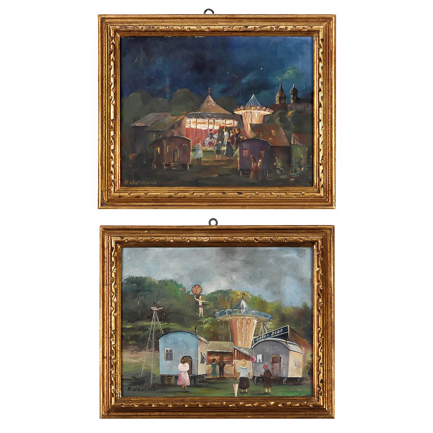 1) Oil on canvas, stretcher frames. a) Two paintings each signed at the bottom "Venmans", 59 x 49 cm (in gilt frame) and 30 x 40 cm. - b) Painting signed at the bottom "A. Wilhelmus", 40 x 30 cm. - c) Painting unsigned, "Im Reiche des Orient", 30 x 28 cm. - d) Picture signed "J. Haansten", 68 x 58 cm. - 2) Canvas, printed, with applications of wool, framed, 45 x 35 cm. - 3) Three-dimensional cut paper fairground scene, signed "Huh Peters", glazed, with passe-partout and gilt frame, 75 x 65 cm. - And: 4) Oil on card, framed. a) Two paintings signed "H. Waldemar", 42 x 35 cm each. - b) Painting signed "S. Spenci", 55 x 45 cm. - All in good condition.