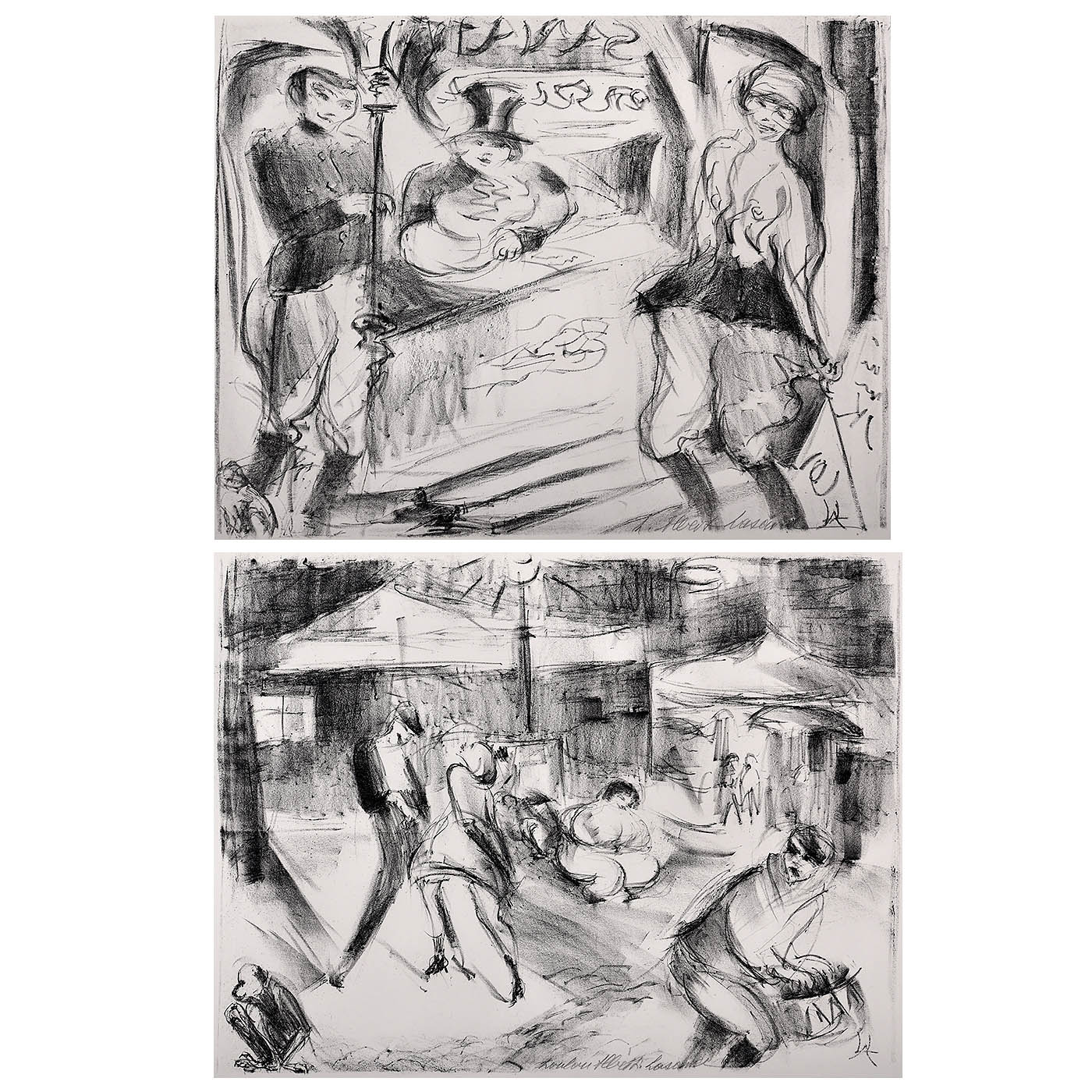 1) Lithograph by Fritz Reuter, 1881, "Fair", printed by C. Hacker's Institut, Berlin, 23 x 33 cm. - 2) Ink drawing by Theodor Grätz, c. 1920, "Circus elephant", for the Fliegende Blätter, 29 x 37 cm. - 3) Four chalk lithographs by Lou Albert-Lasard, c. 1925, from the series "Montmatre", signed, published by Kiepenheuer-Verlag, Potsdam, 37 x 48 cm. - 4) Lithograph after Johan Fredrik Martin, London 1772, "The Sausage Woman, or a Scene in Covent Garden", printed for Robert Sayer, 25 x 35 cm. - 5) Copper engraving after Karel Dujardin, "Les Charlatans", 31 x 26 cm. - 6) Lithograph, c. 1840, "Der Hühnermarkt in Frankfurt am Main", 50 x 34 cm. - 7) Pencil drawing by J Schultz-Dahl, 1927, "Blumenverkäuferin", print no. 17/50, signed by hand on lower right, 25 x 32 cm.