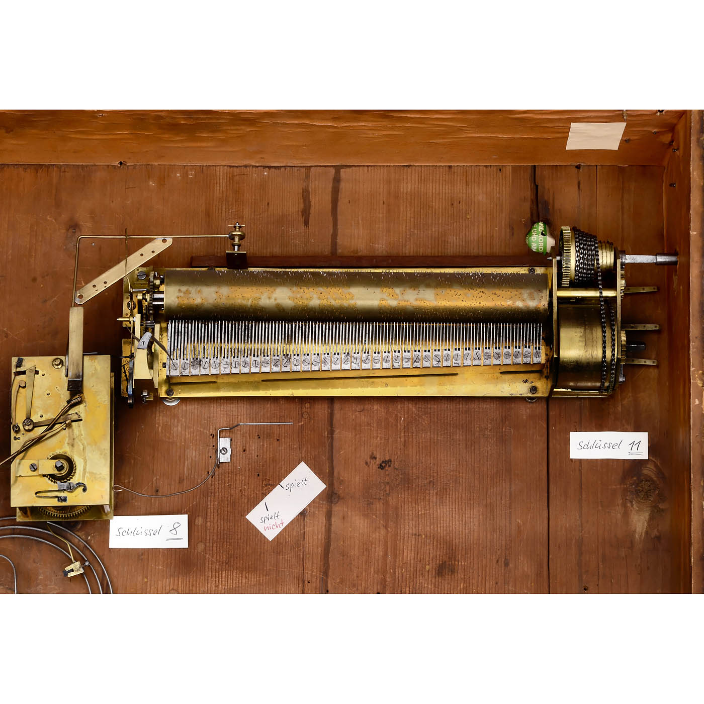 Oil on canvas of a riverside with figures, buildings and church steeple with clock, with two-train movement striking hours on gong, separate movement for the quarters and music upon the hour, the cylinder musical movement with fusee spring, sectional comb of thirty-seven sets of three teeth and a separate bass tooth (one tooth with ineffective solder repair), brass bedplate and three-gear governor train, in giltwood and gesso frame with corner relief of flowers and shells, 27 x 31 in. (68.5 x 79 cm), cylinder 10 ½ in. (26.7 cm), painting with craquelure, repair and overpaint, vacant holes in backboard, musical movement playing but can be reluctant to start, damper noise, clock movement untested, with non-fitting key. The fusee movement predates the clock by some years. The additional holes in the backboard and the side of the frame suggest the former presence of another musical movement.