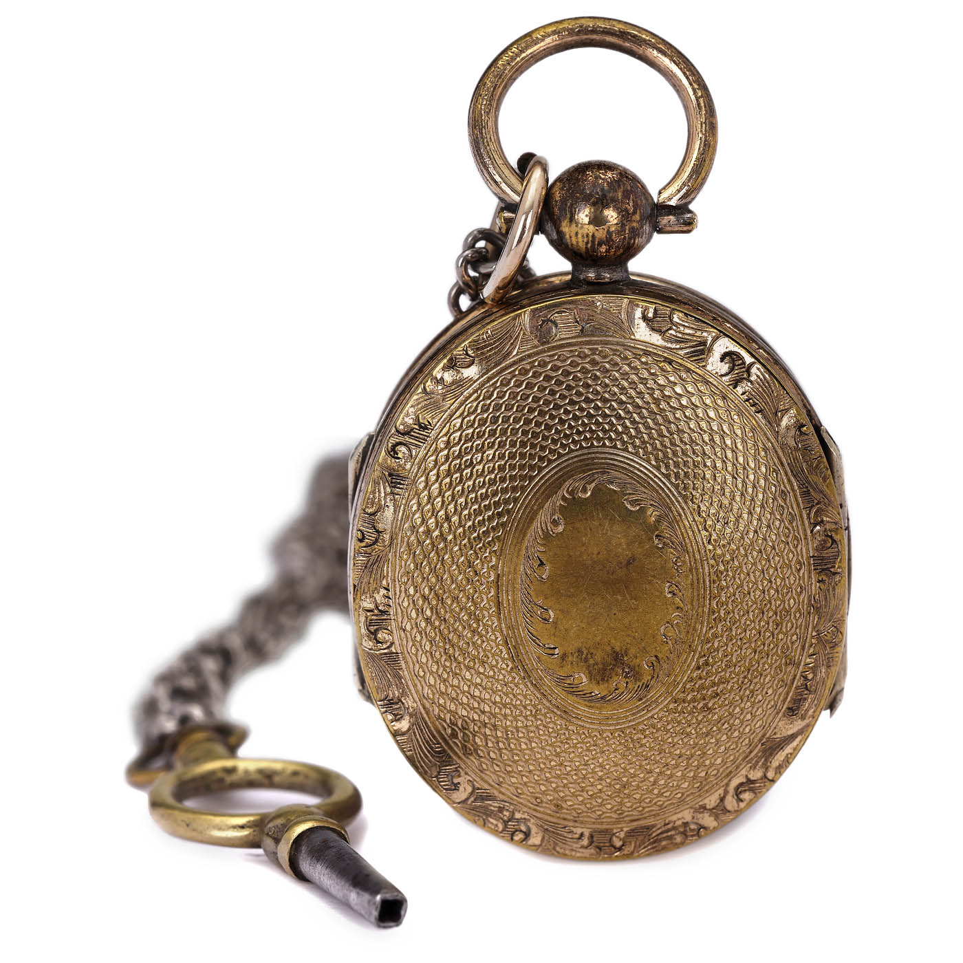 No. 1705, with Barillet movement playing single air on stack of eight steel teeth, engine-turned silver-gilt case with floral and foliate borders, opening on both sides for access to movement, with suspension loop, ht. including loop 1 ¾ x wd. 1 in. (4.5 x 2.5 cm), playing condition, movement now soldered into case, one inner surface of polished metal, the other now painted. - An unusual form.
