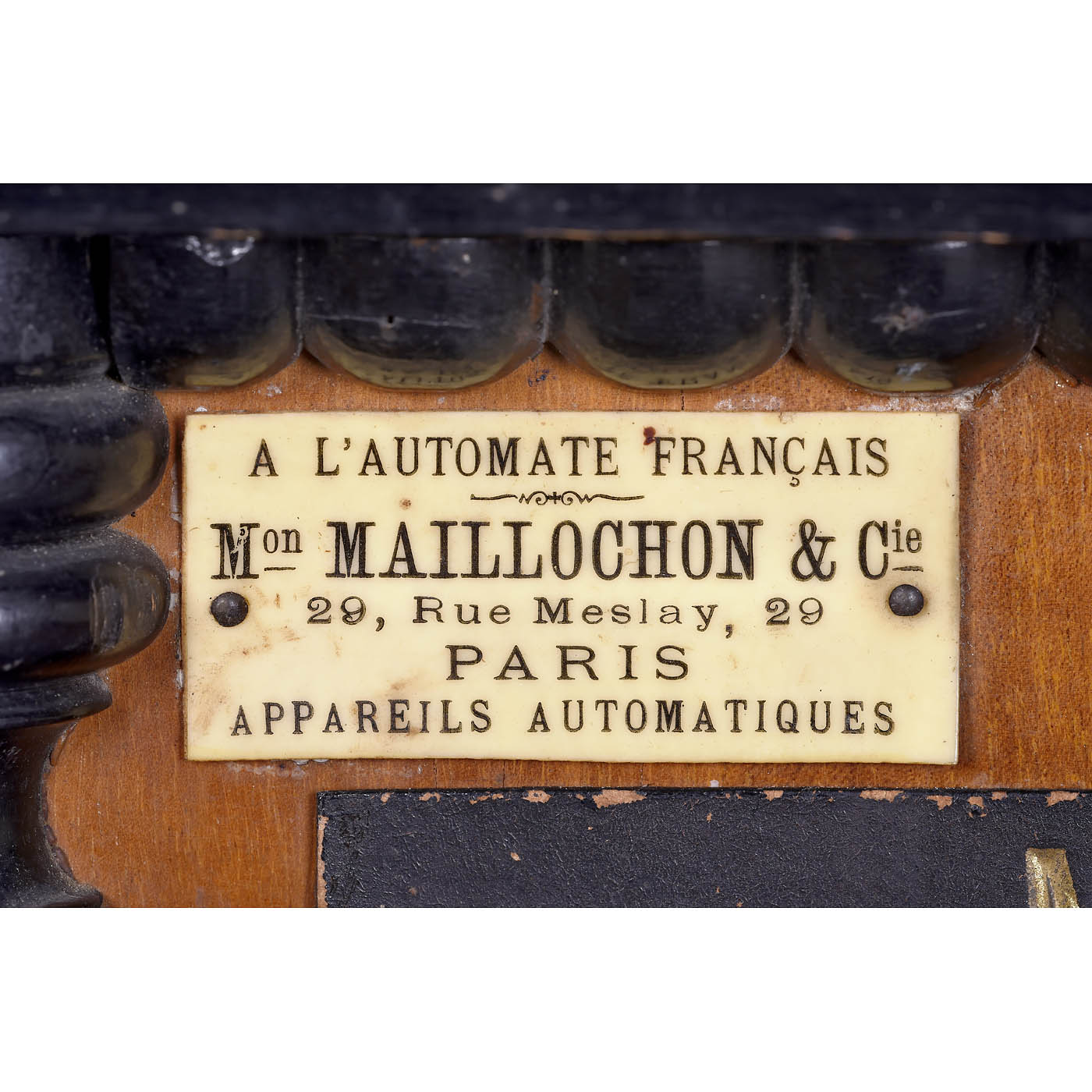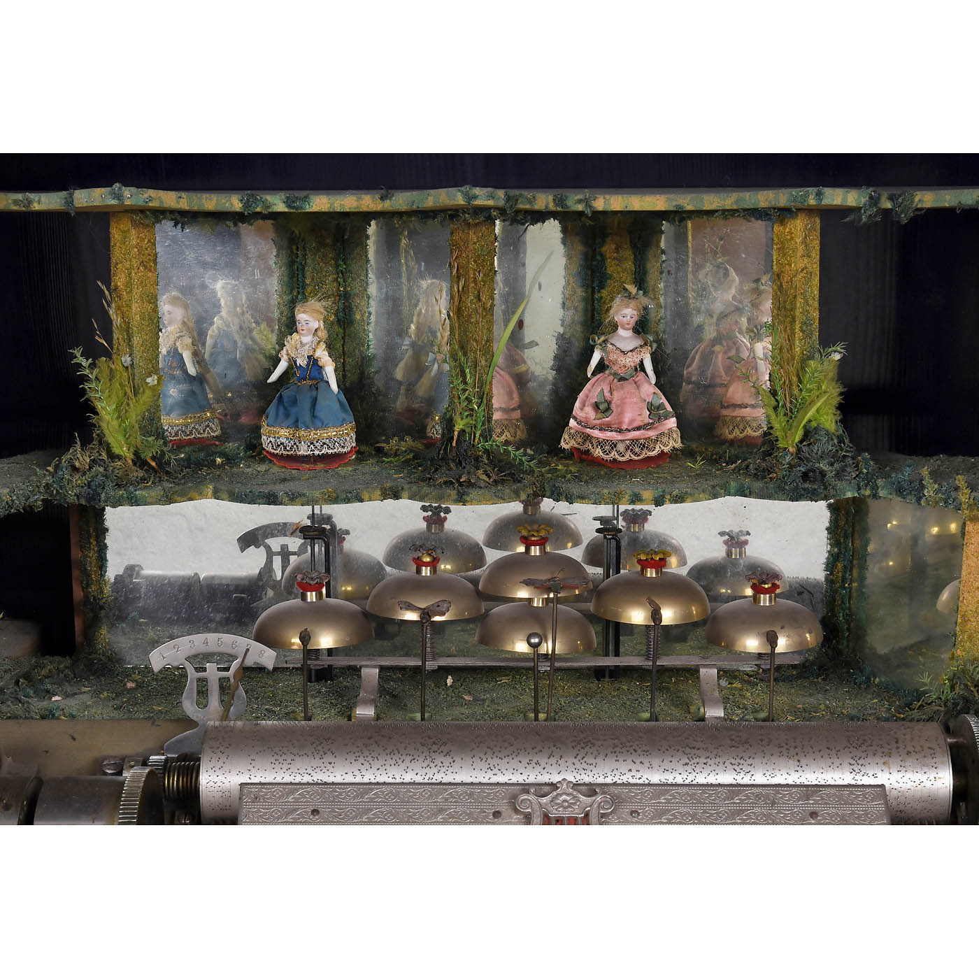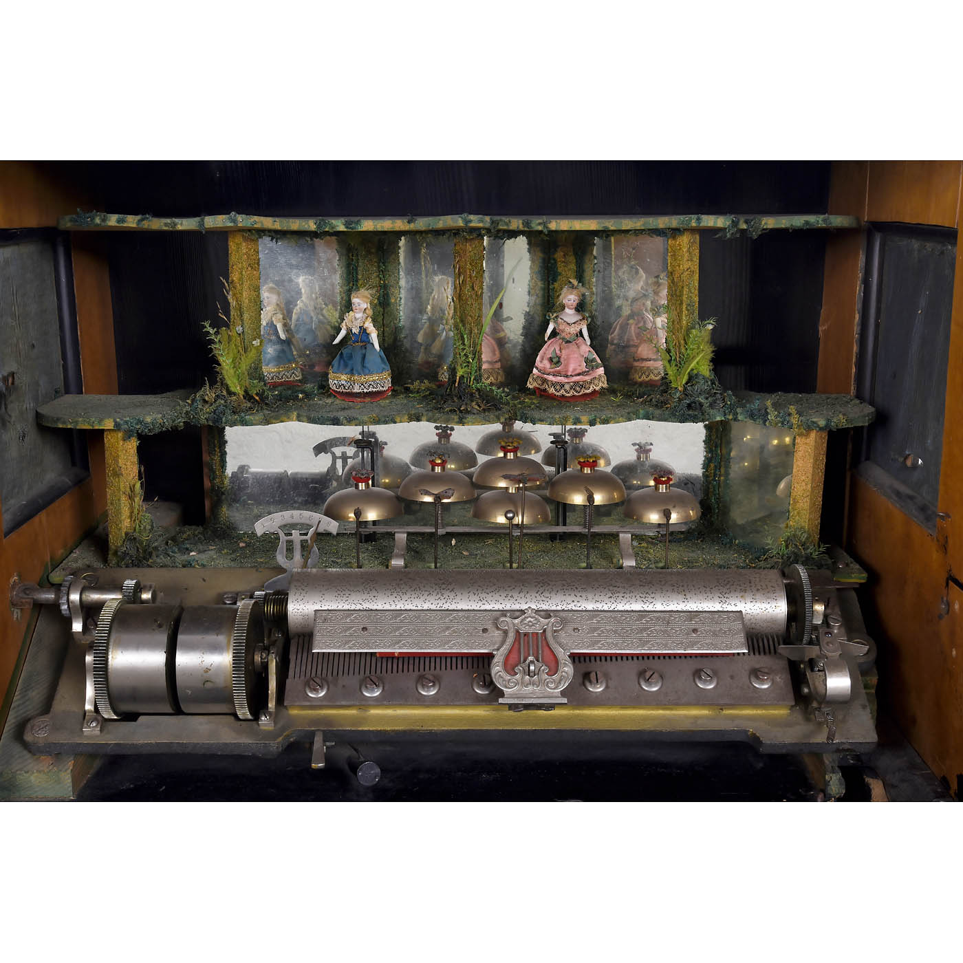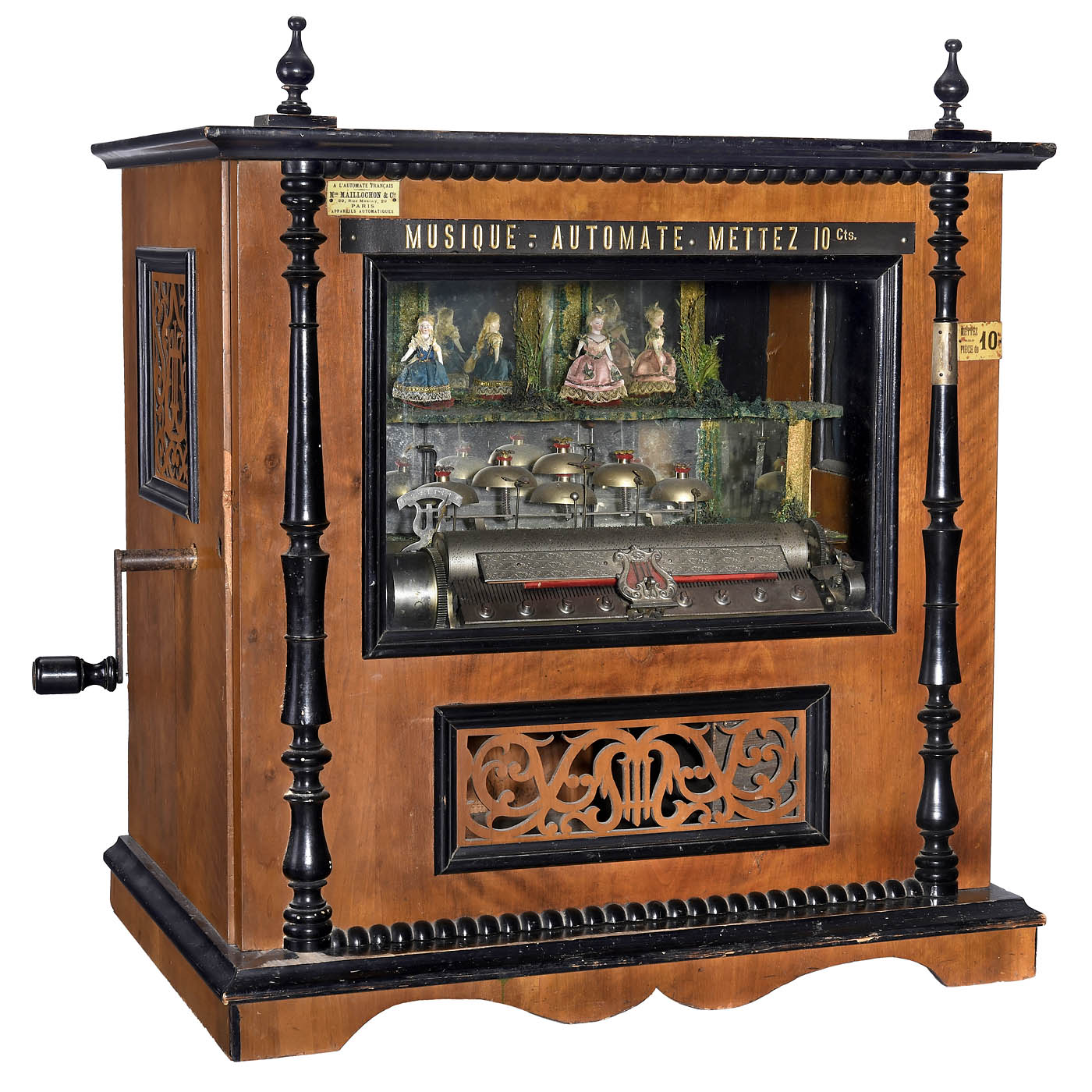 No. 8538, playing eight popular and operatic airs including a lively rendition of the "Freyschütz" overture by Weber, accompanied by six optional bells with flower finials and two bisque dolls (in original silk costumes) dancing in mirrored grotto decorated with feather ferns and foliage, with 93 teeth in comb (complete), nickel-plated movement, double-springs with original winding crank, tune-indicator and zither attachment, in walnut-veneered case with glazed front, fretwork sound panels, coin-slot for 10 centimes and celluloid retailer’s or operator’s plaque: "A l’Automate Français, Appareils Automatiques, Mon. Maillochon & Cie., 29 Rue Meslay, Paris", wd. 28 in. x ht. 28 in. x dp. 19 ½ in. (71 x 71 x 49 cm), cylinder 13 in. (33 cm), four of the five butterfly strikers without wings, missing coin-trip, case without pediment, movement and case in generally good unrestored condition. An unusually complete and original station musical box with signage, harmonious accompaniment and dancing dolls in fanciful garden setting.