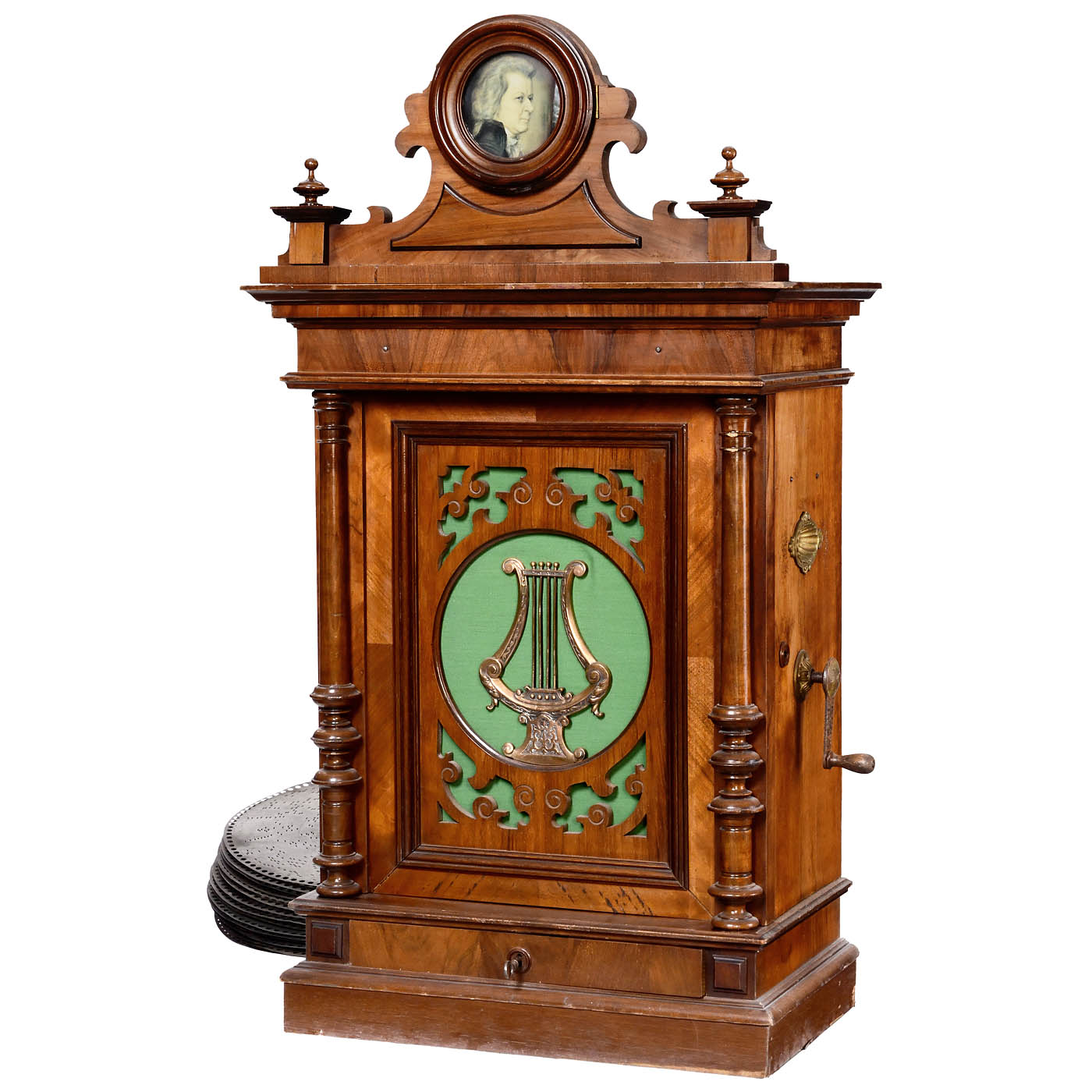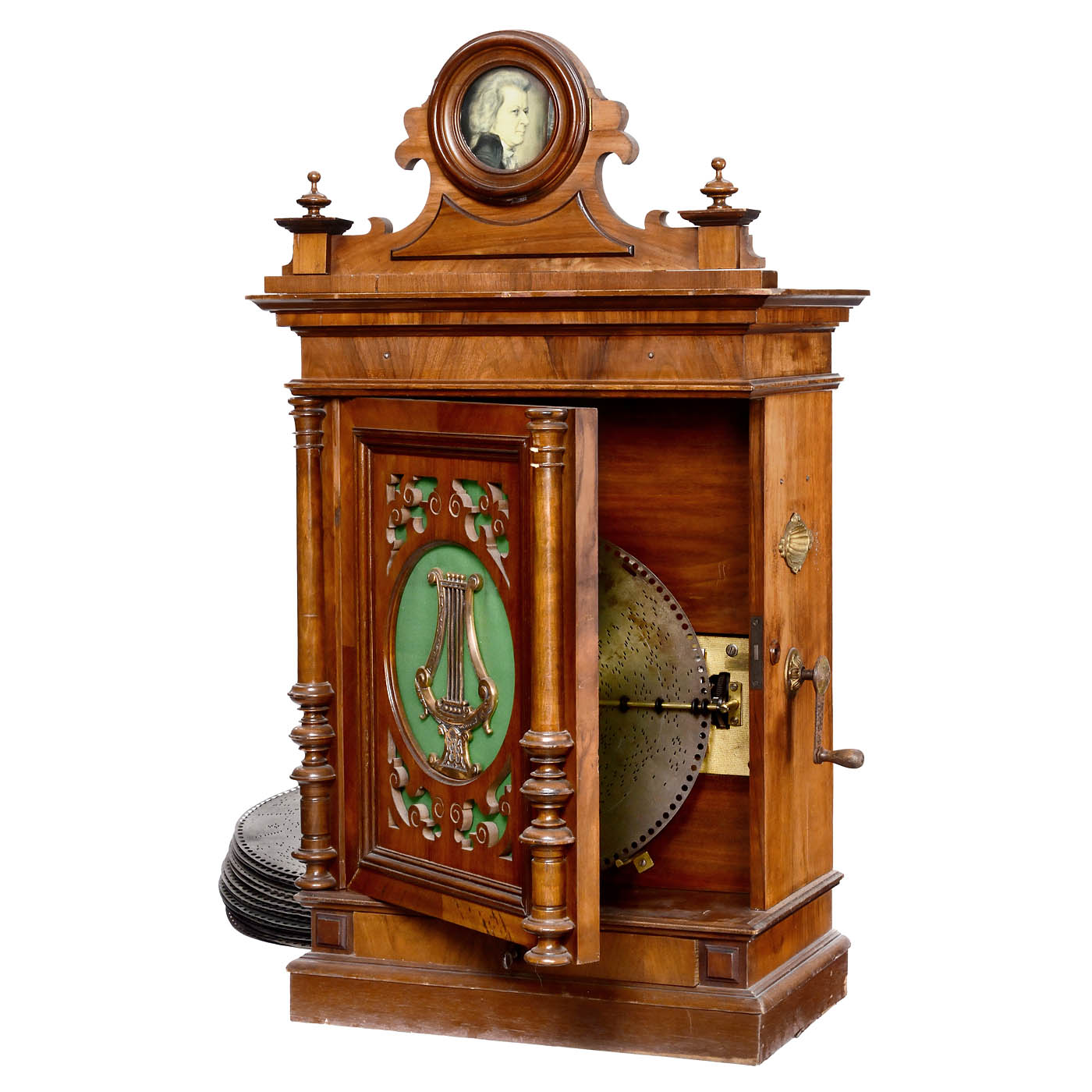 Polyphon Musikwerke, Leipzig. No. 51379, 77 teeth in comb (complete), walnut case with pediment (missing clock) and brass lyre in door, with 27 discs. Dampers in need of adjustment, otherwise in playing condition.