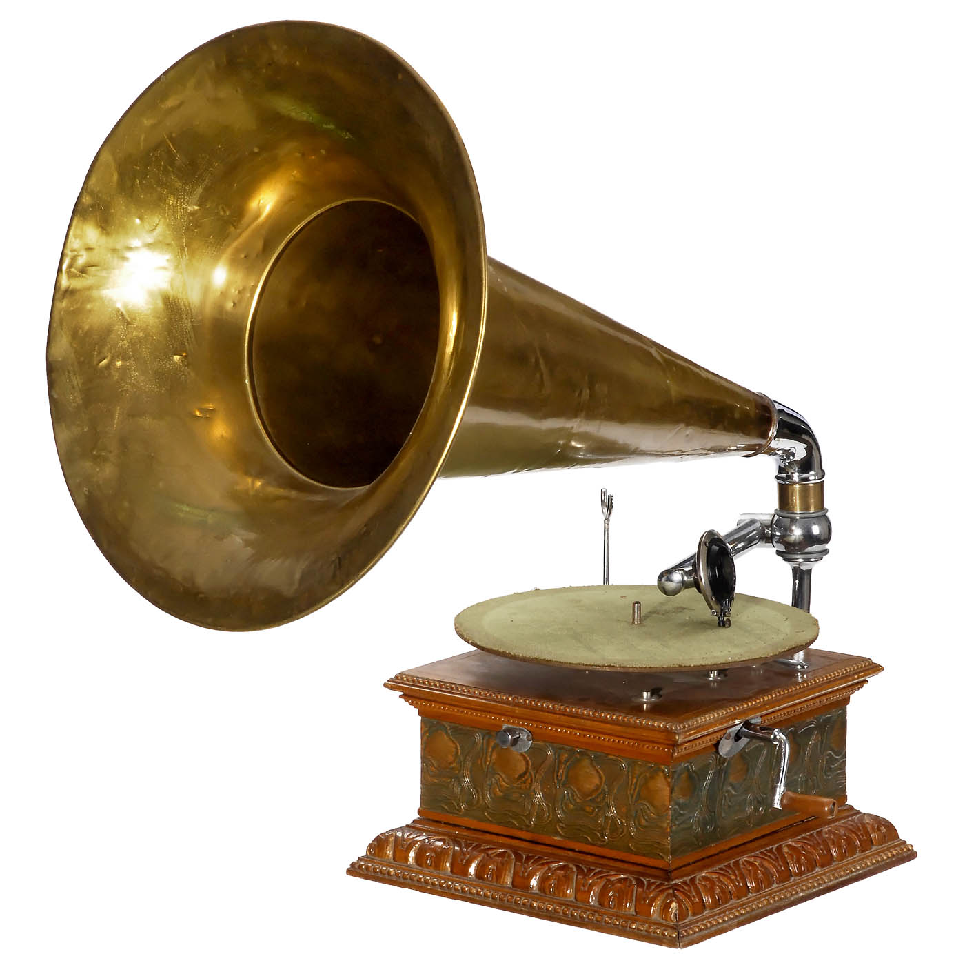 Embossed walnut case, green-stained wood sides, 12-inch turntable, Goldring Special Electro mica soundbox, brass horn, length 30 in., Ø 17 3/4 in., good working condition.