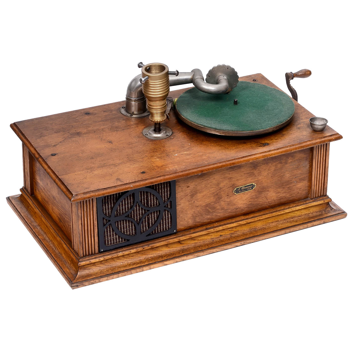 Wilhelm Dietrich, Leipzig. Oak case, 10 in. turntable, automatic end stop, Mozart mica soundbox, cast-iron Christmas tree stand (renewed), good working condition, dimensions 25 x 15 2/5 x 13 ¾ in. - Very rare.