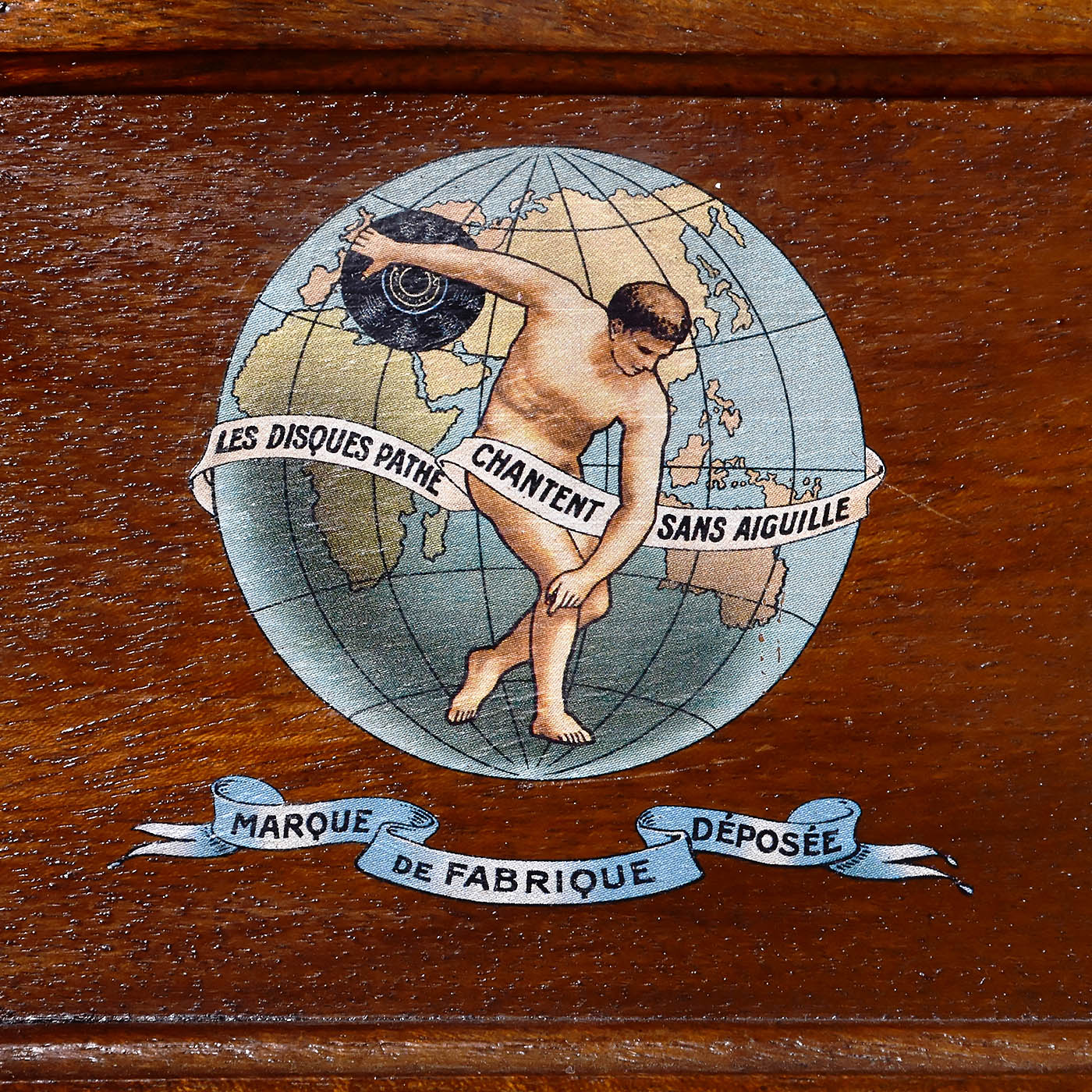 Pathé, Paris. For horizontally-cut records, walnut case with Pathé transfer (discus thrower in front of earth globe), Pathé Concert mica reproducer, large tin horn, Ø 24 in., working.