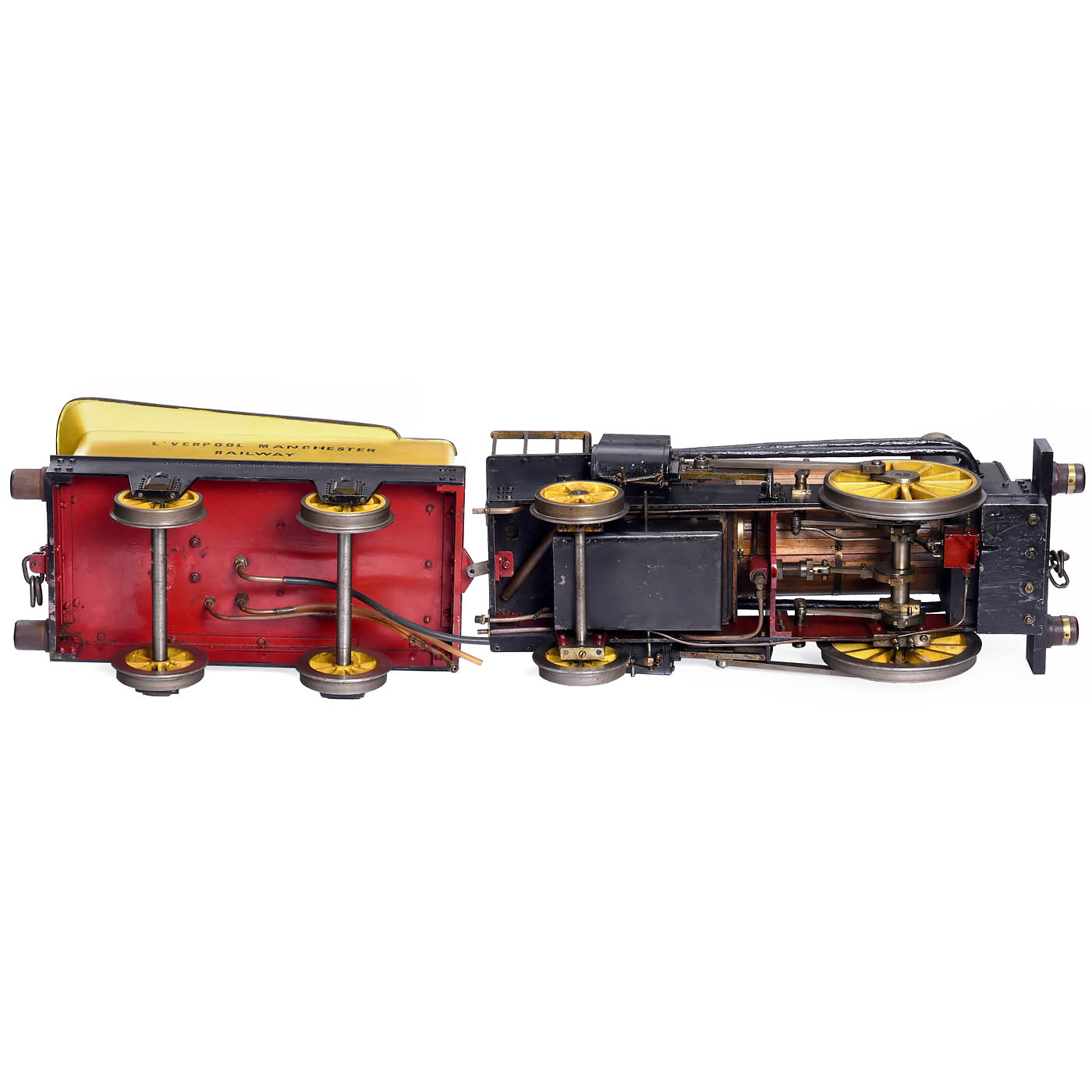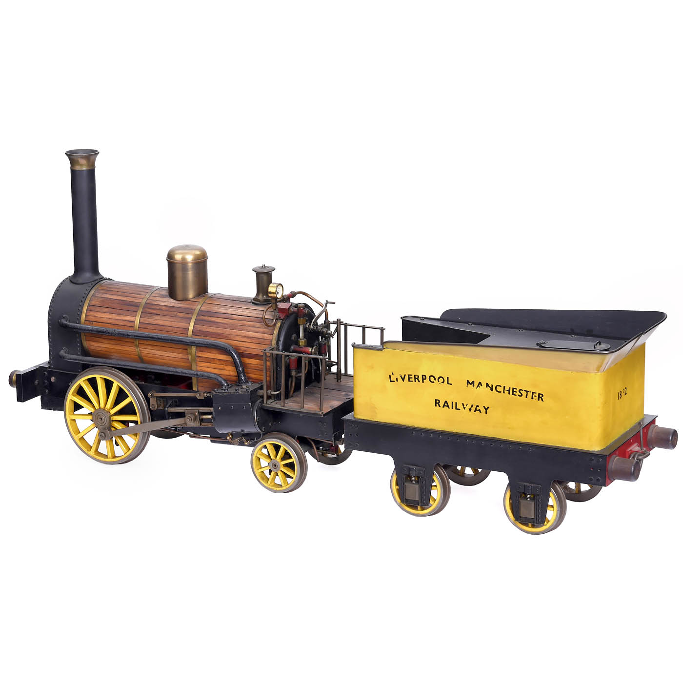 Coal-fired live steam locomotive, cast-iron flame tube boiler with hardwood planking and brass banding, fitted pressure gauge, water gauge level, regulator and safety valve, two external cylinders driving the front wheel, wood buffers and driver's safety rails, with spring-loaded two-axle tender of the Liverpool Manchester Railway, with coal box and water container, total length 33 ½ in.