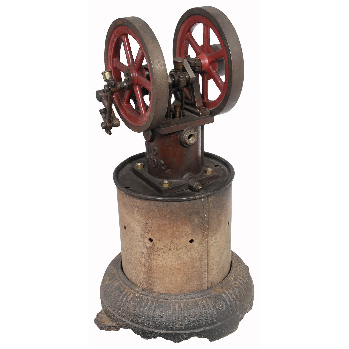 Concentric displacer and working cylinders, overhead crank, twin 7-inch flywheels, cast water jacket embossed "GHD Motor", on iron base and cast circular base, overall height 21 ¼ in.